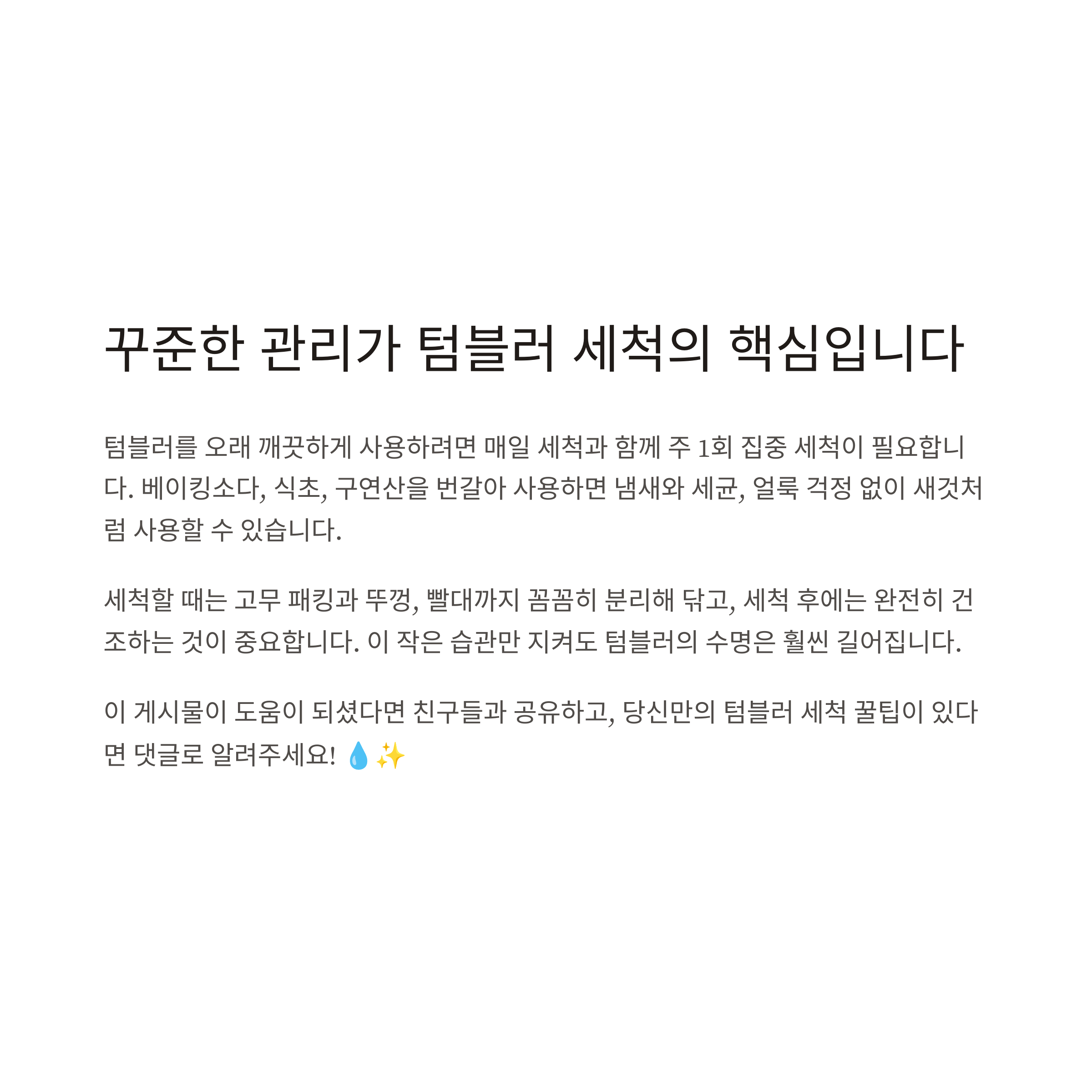 | 완전 건조 | 뚜껑 열고 거꾸로 건조 | 세균·곰팡이 예방 |