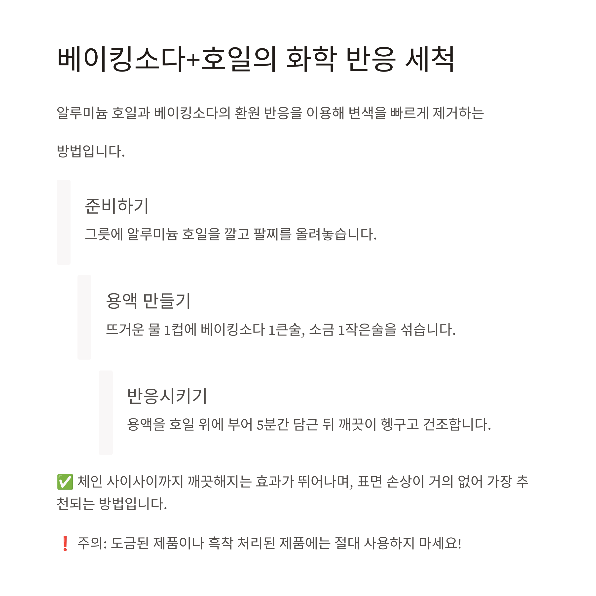 | 베이킹소다+호일 | 호일+뜨거운 물+베이킹소다+소금 5분 | 90~95% | 월 1~2회 | 도금/흑착 제품 주의 |
