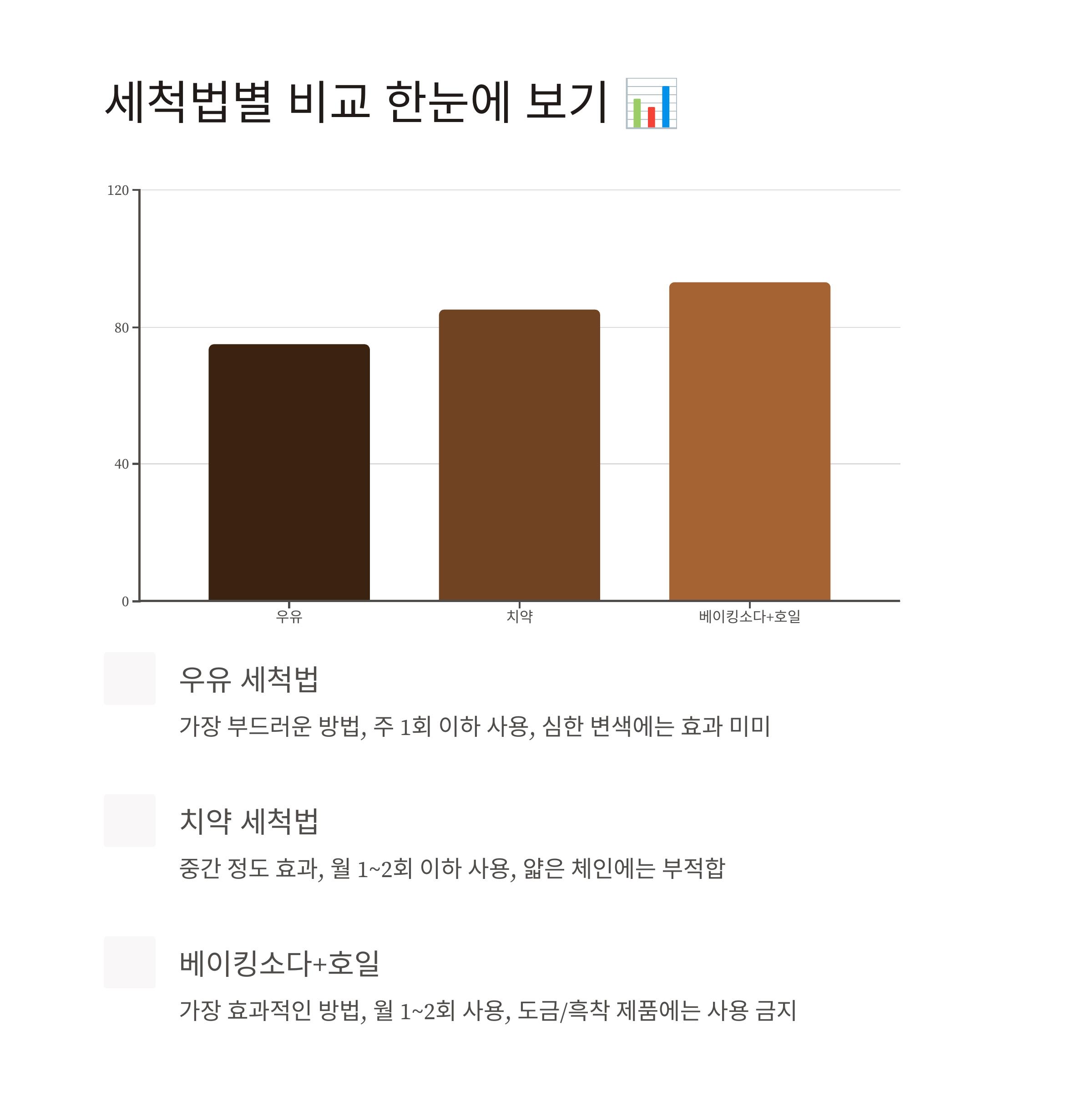 | 우유 | 미지근한 우유에 5~10분 담금 | 70~80% | 주 1회 이하 | 심한 변색에는 미미 |