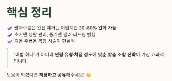 팔자주름은 “비법 하나”가 아니라 연령·유형·처짐 정도에 맞춘 맞춤 조합 전략이 가장 효과적입니다.