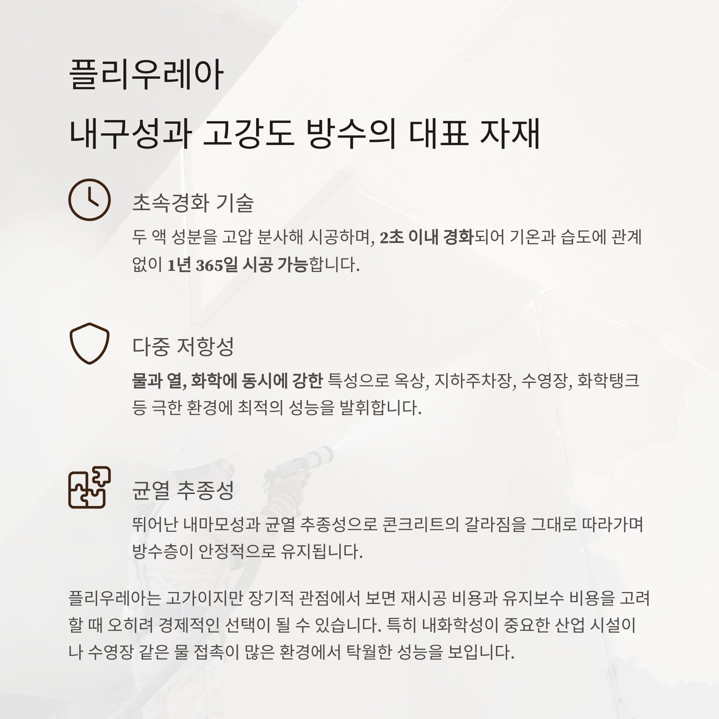 - 플리우레아는 빠른 경화, 뛰어난 내구성, 열·수분·화학에 모두 강한 방수를 원하는 현장에 최적이며,