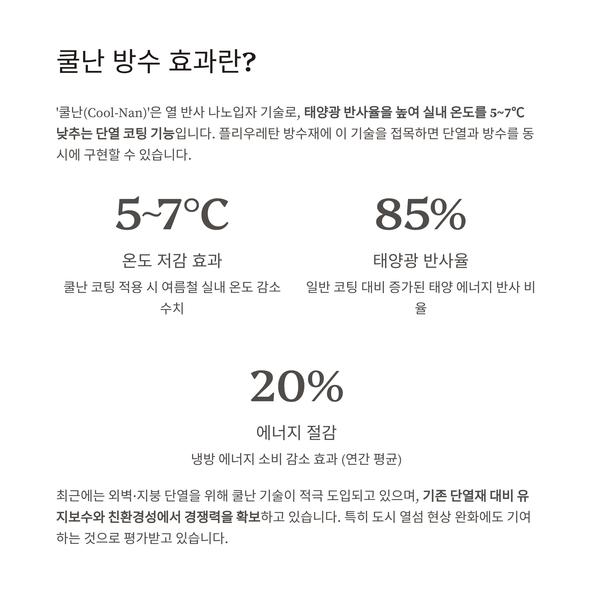 최근에는 외벽·지붕 단열을 위해 쿨난 기술이 적극 도입되고 있으며,