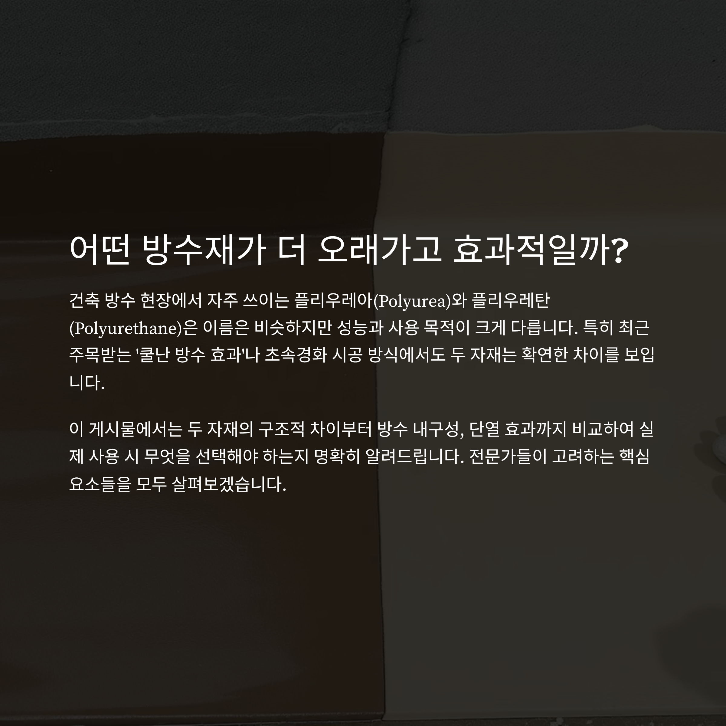특히 최근 주목받는 '쿨난 방수 효과'나 초속경화 시공 방식에서도 두 자재는 확연한 차이를 보입니다.