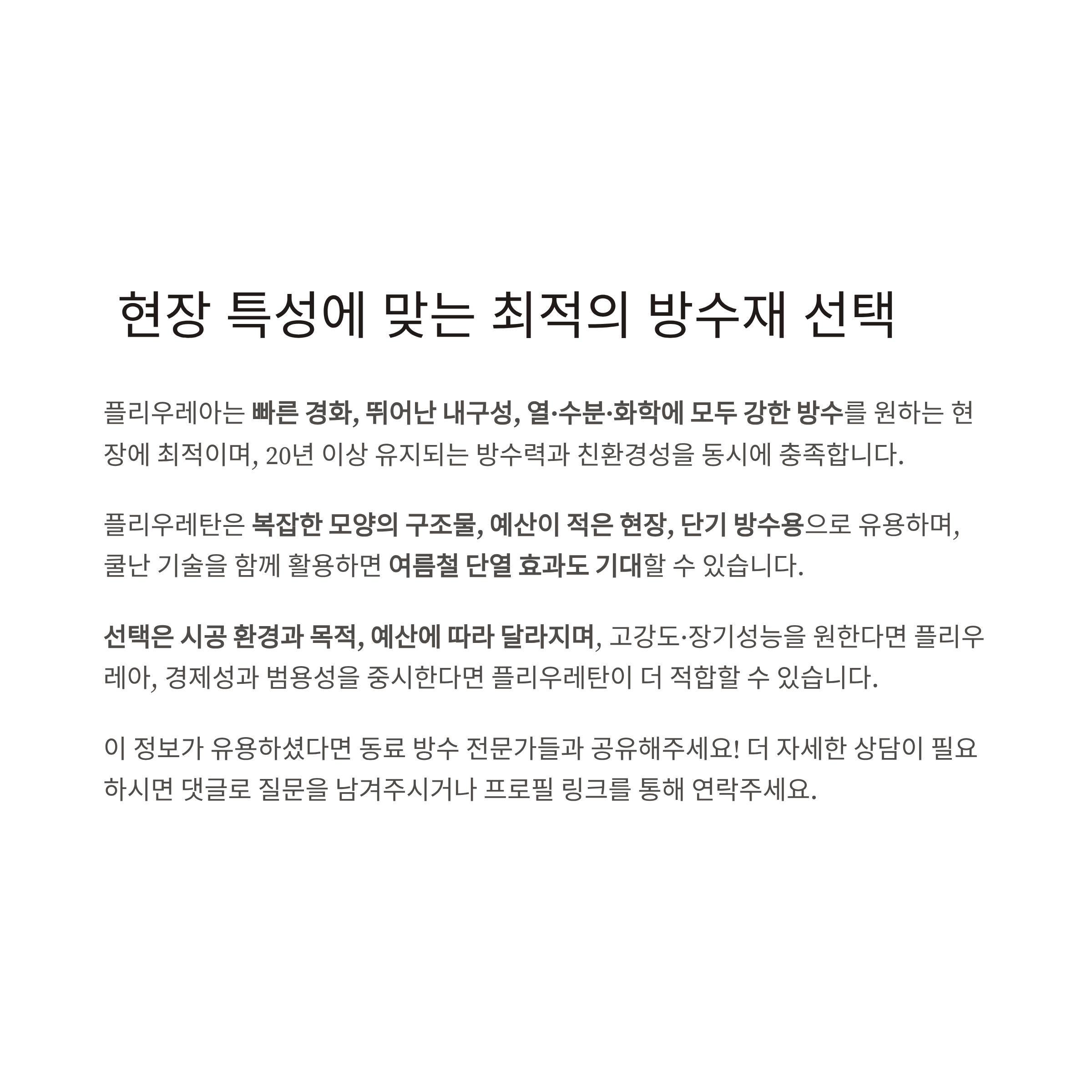 20년 이상 유지되는 방수력과 친환경성을 동시에 충족합니다. - 플리우레탄은 복잡한 모양의 구조물, 예산이 적은 현장, 단기 방수용으로 유용하며,