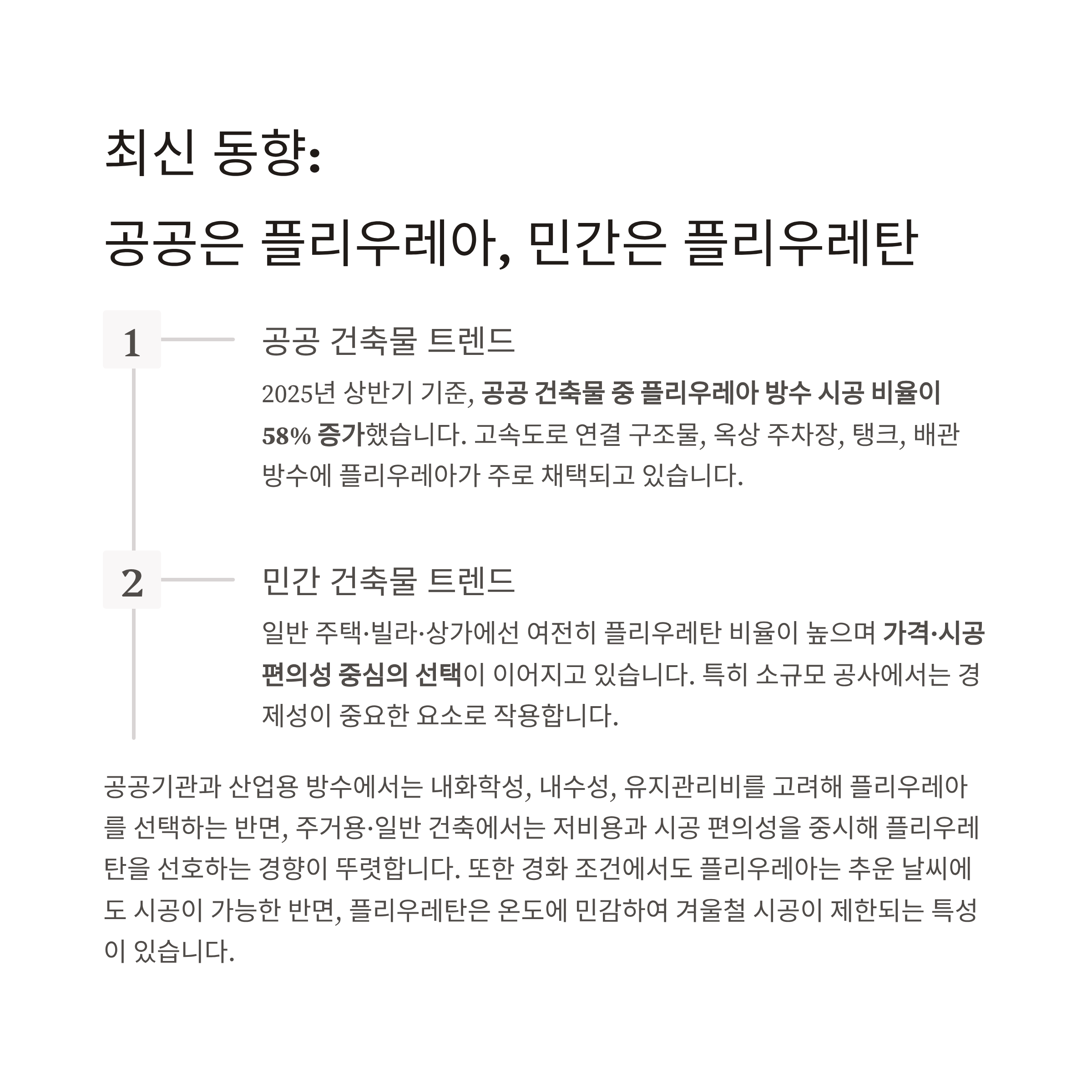 - 2025년 상반기 기준, 공공 건축물 중 플리우레아 방수 시공 비율이 58% 증가