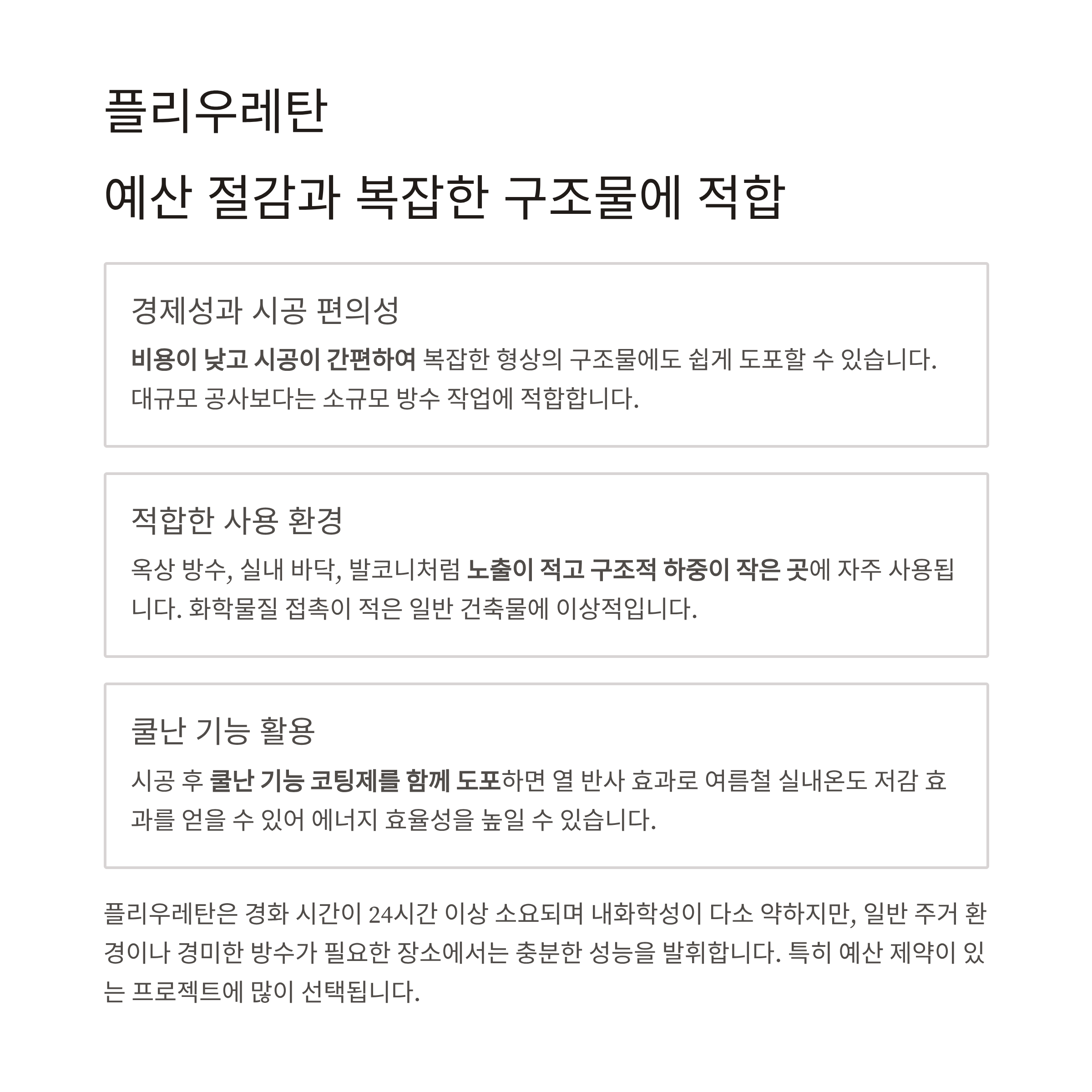 플리우레탄은 비용이 낮고, 시공이 간편해 복잡한 형상에도 도포 가능합니다.