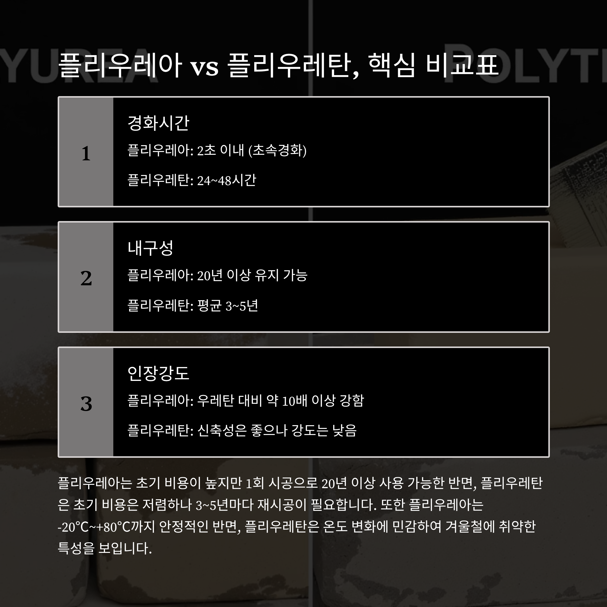 | 경화 조건 | 초속경화, 추운 날도 가능 | 온도에 민감, 겨울 시공 제한됨 |