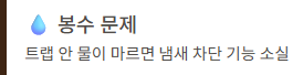 트랩 안에 물이 마르면 냄새를 막는 기능이 사라지게 됩니다.