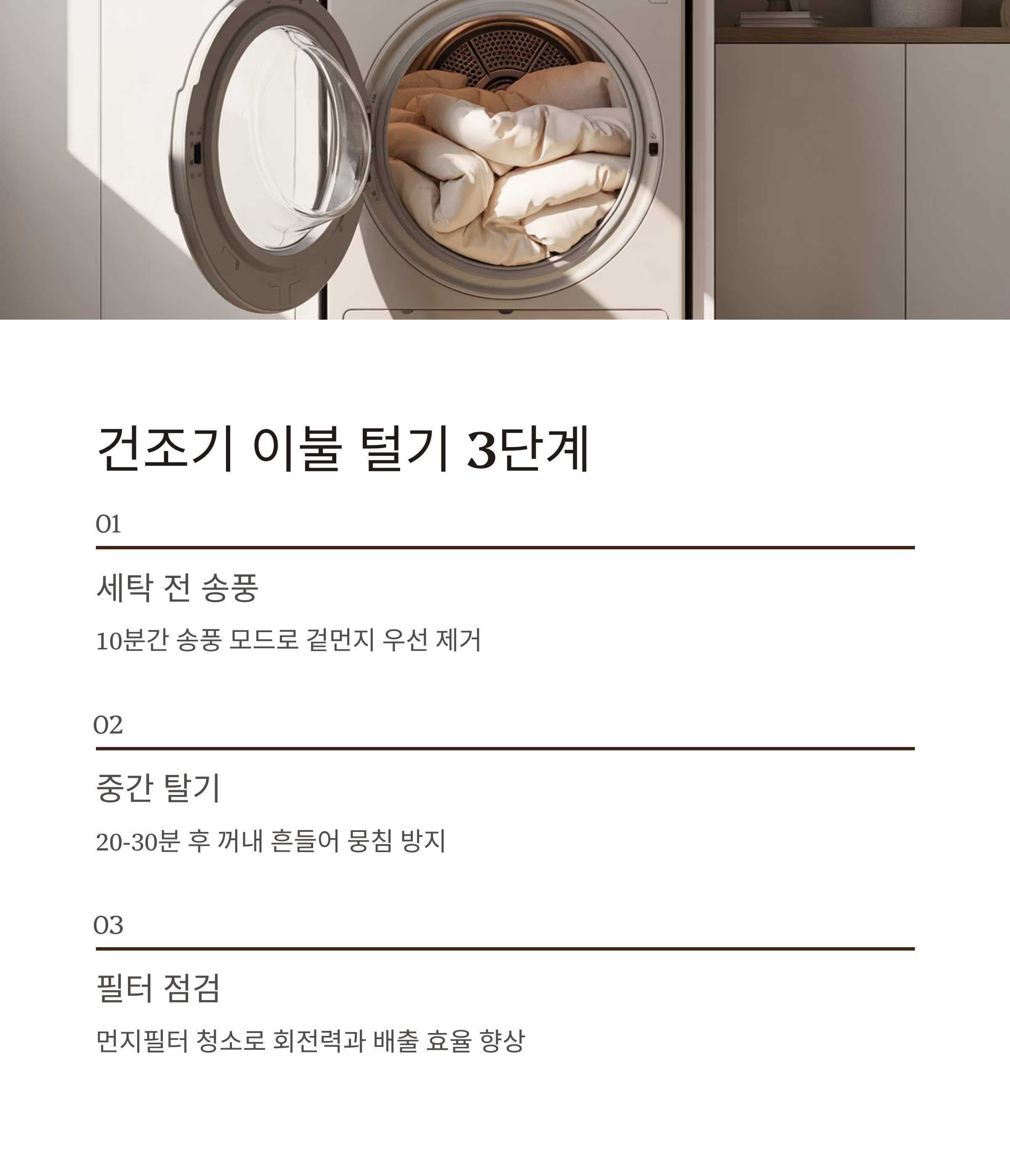 | 건조 전 털기 | 세탁 전 매번 | 10분 송풍 + 도중 탈기 | 뭉침·먼지 제거↑ |