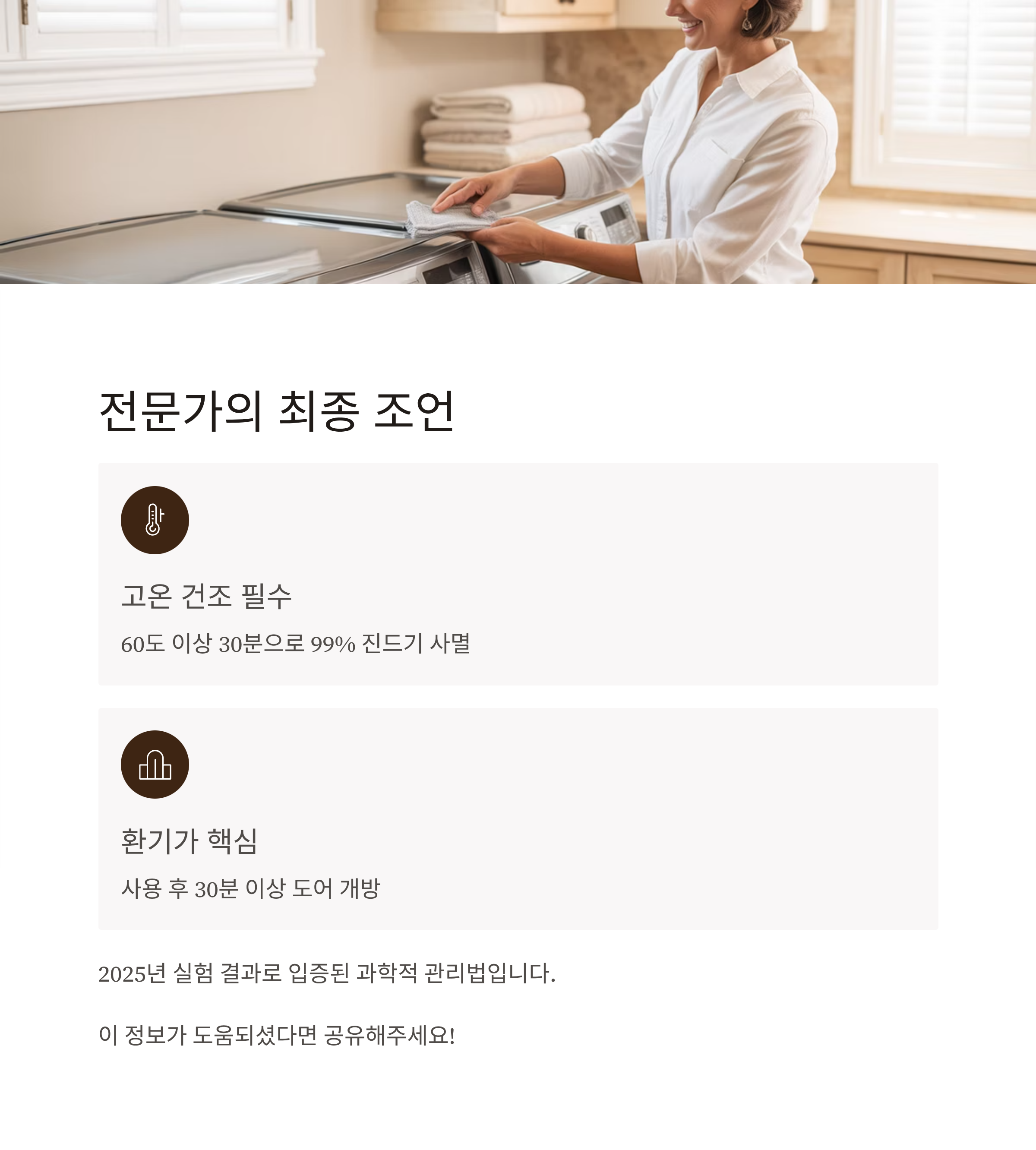 | 건조기 환기 | 매회 30분 이상 | 문 열어두고 습기 제거 | 냄새·곰팡이 예방 |