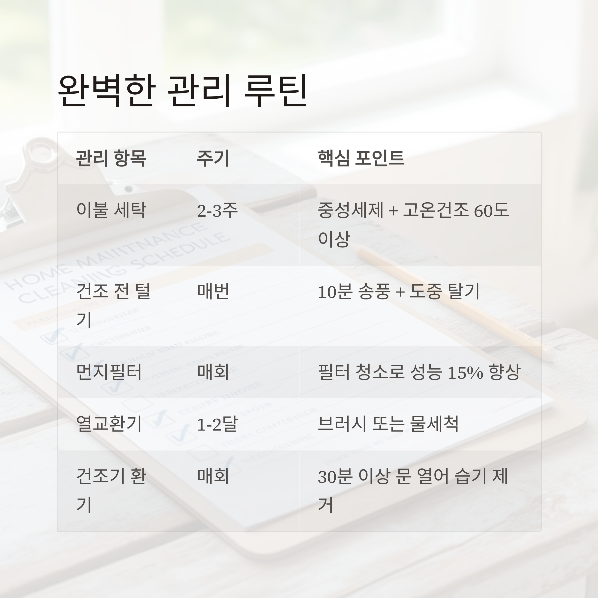 | 이불 세탁 | 2~3주 1회 | 중성세제 + 고온 건조(60도 이상) | 세탁망 필수 |