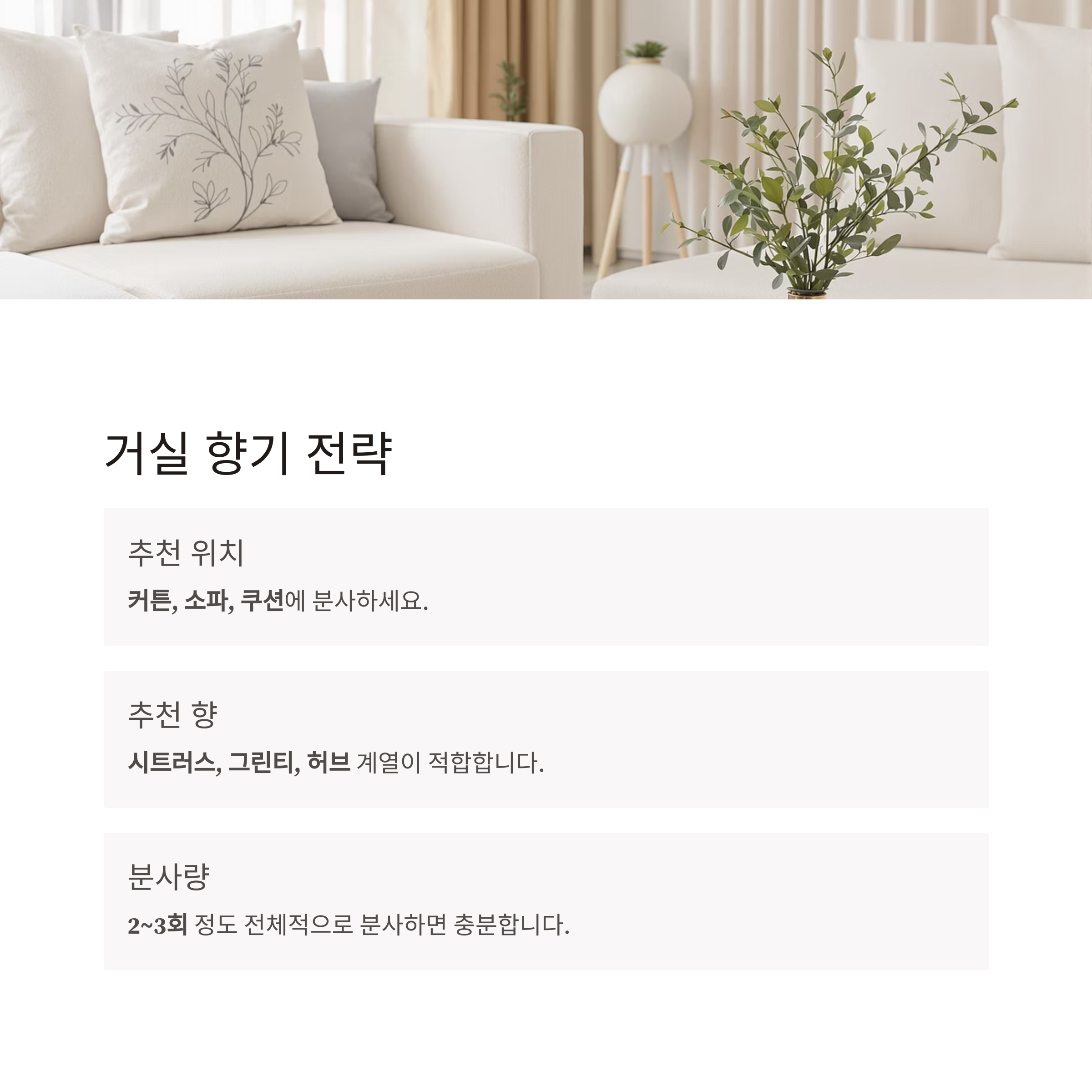 | 거실 | 시트러스, 그린티 | 커튼, 소파, 쿠션에 2~3회 분사 |