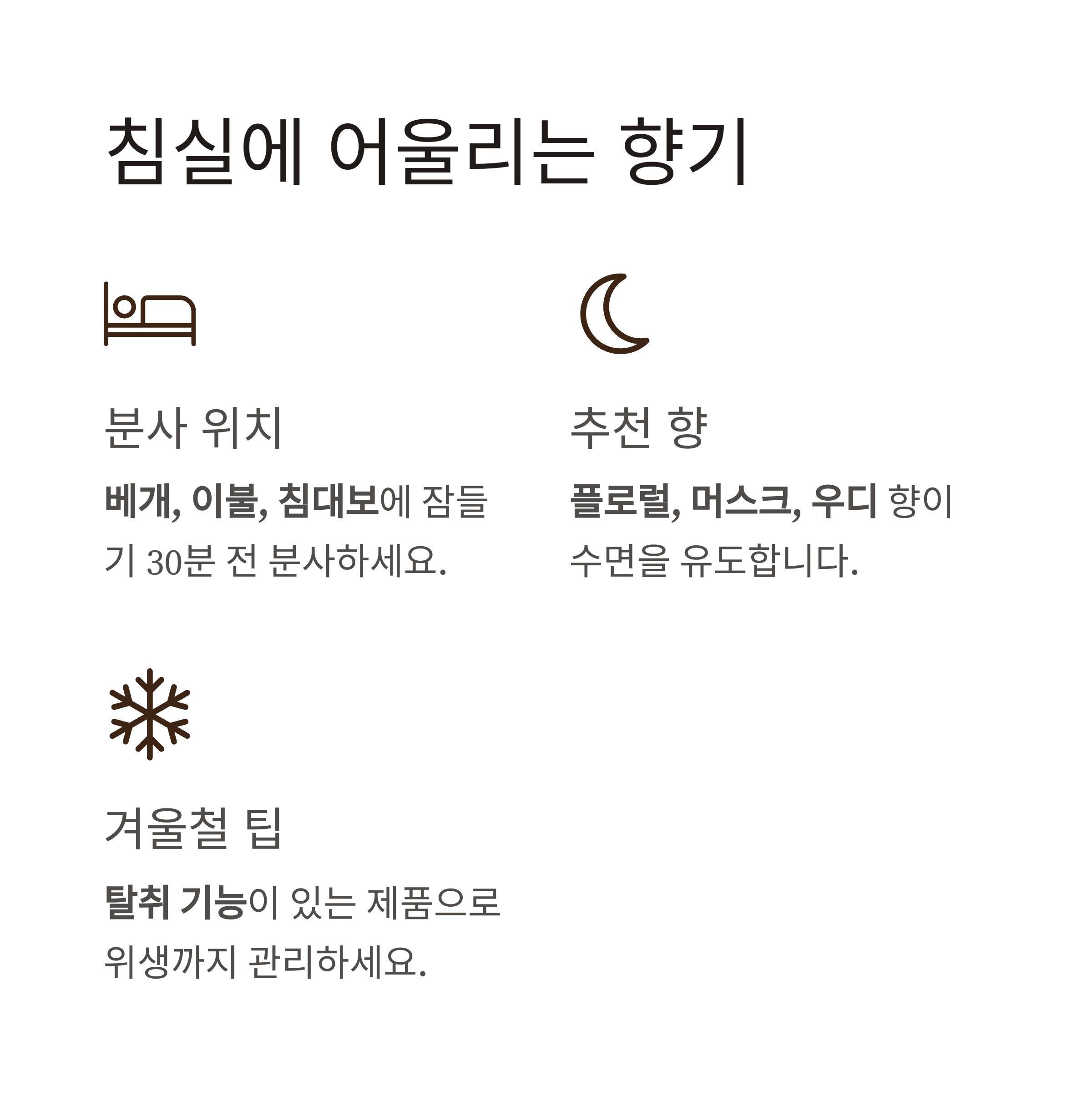 | 침실 | 플로럴, 머스크 | 침구 전체에 잠들기 30분 전 분사 |