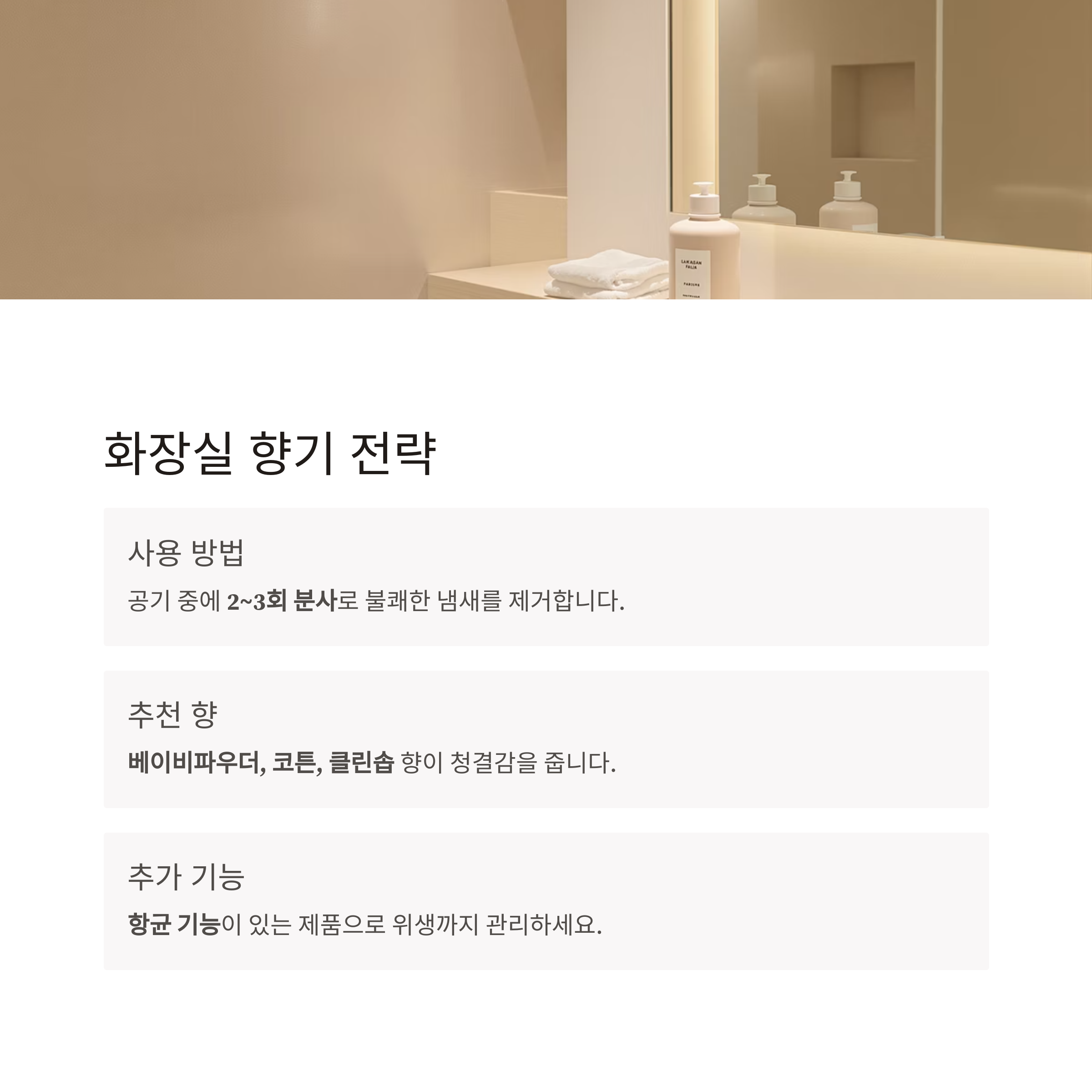 | 화장실 | 파우더, 클린솝 | 사용 후 공기 중 2~3회 뿌리기 |