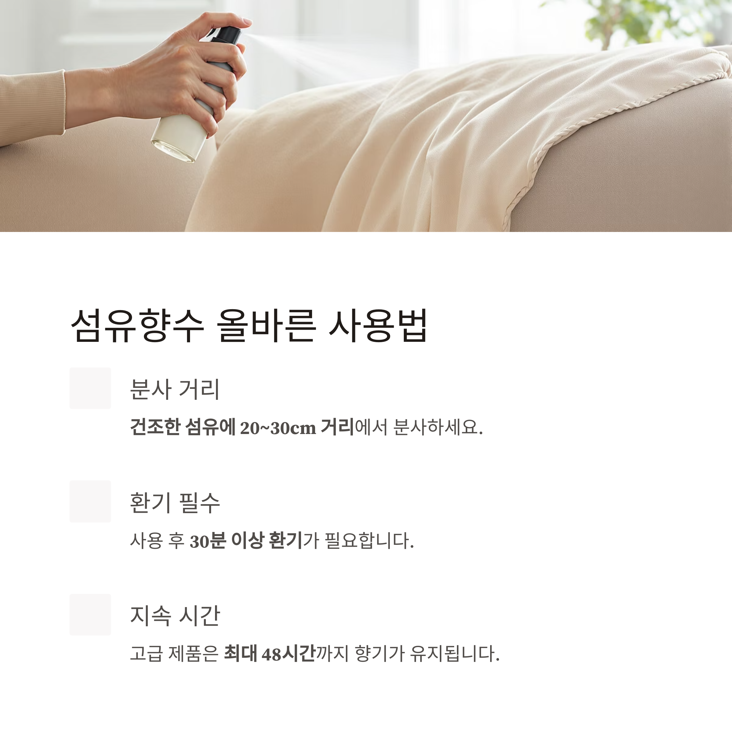 - 전체적으로 넓게 1~2회 분사하는 것이 은은한 발향을 유지하는 데 효과적입니다.