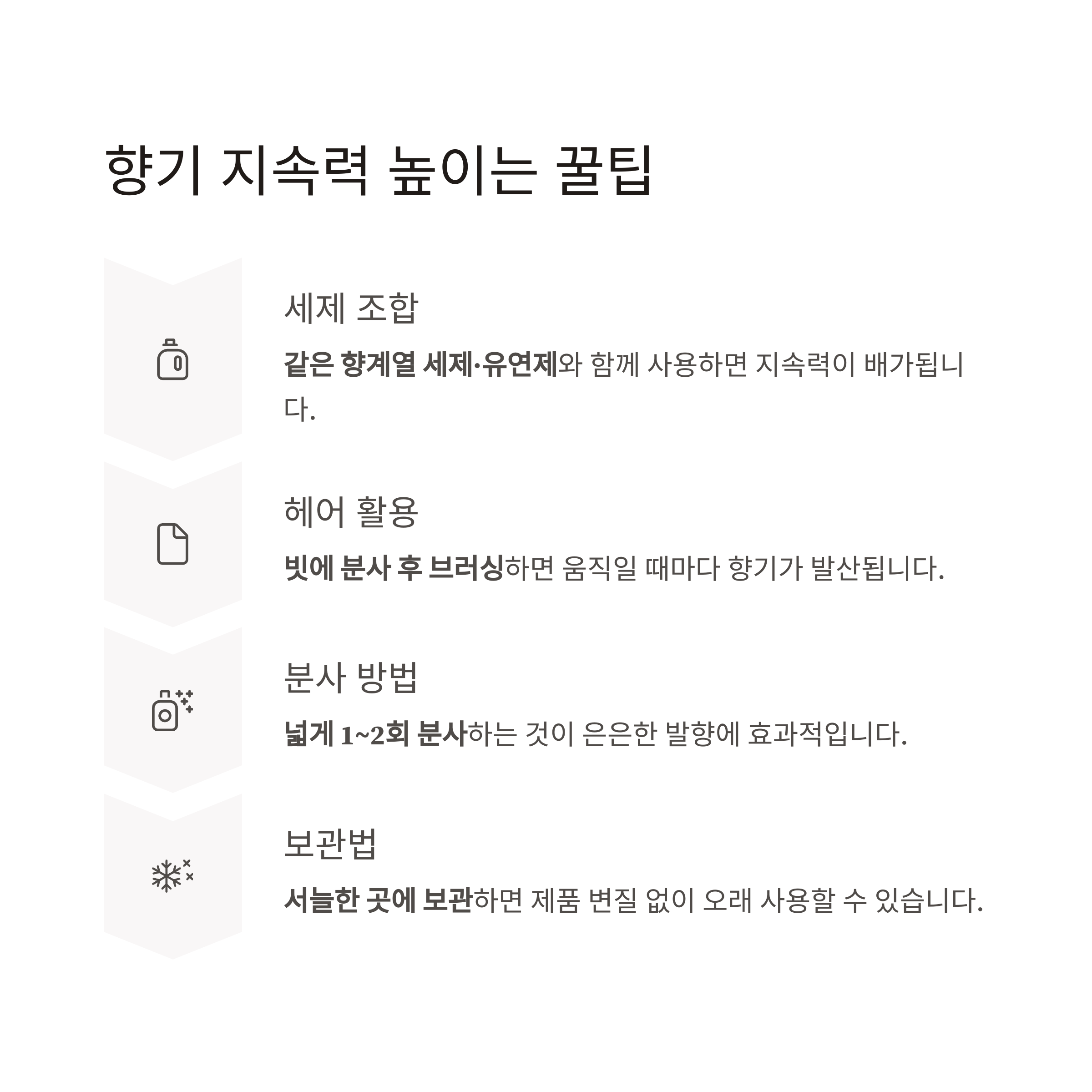 - 전체적으로 넓게 1~2회 분사하는 것이 은은한 발향을 유지하는 데 효과적입니다.