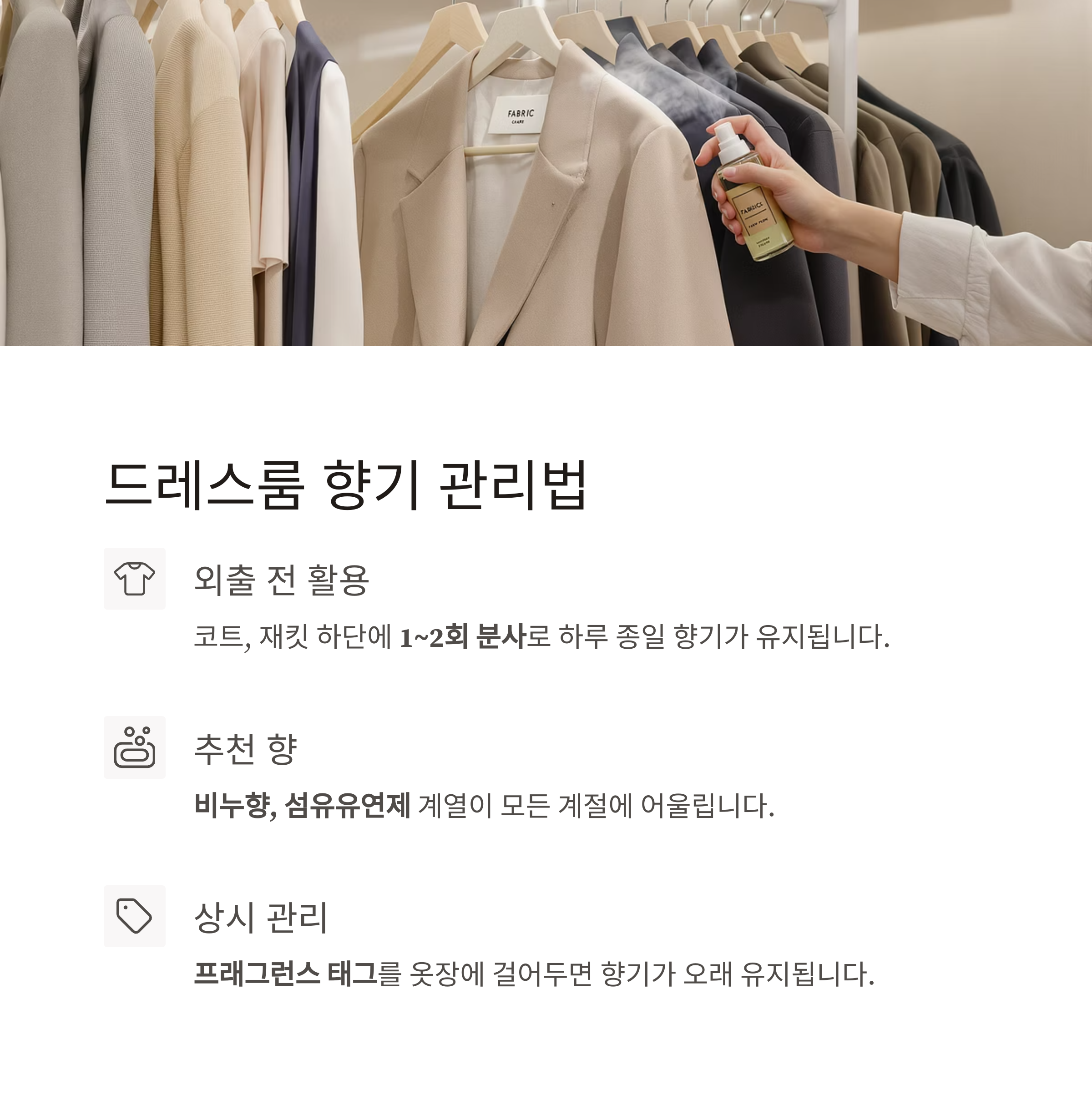 또한 프래그런스 태그를 옷장 안에 걸어 상시 관리하면 향기 유지에 큰 도움이 됩니다.
