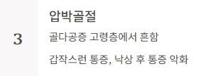 압박골절 골다공증 고령층에서 흔함 갑작스런 통증, 낙상 후 통증 악화