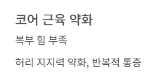 코어 근육 약화 복부 힘 부족 허리 지지력 약화, 반복적 통증