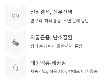 신장결석, 신우신염 옆구리+허리 통증, 소변 문제 동반