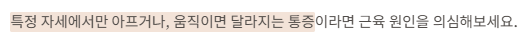 특정 자세에서만 아프거나, 움직이면 달라지는 통증이라면 근육 원인을 의심해 보세요.