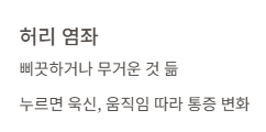 허리 염좌 삐끗하거나 무거운 것 듦 누르면 욱신, 움직임 따라 통증 변화