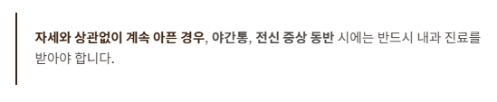 자세와 상관없이 계속 아픈 경우, 야간통, 전신 증상 동반 시에는 반드시 내과 진료를 받아야 합니다.