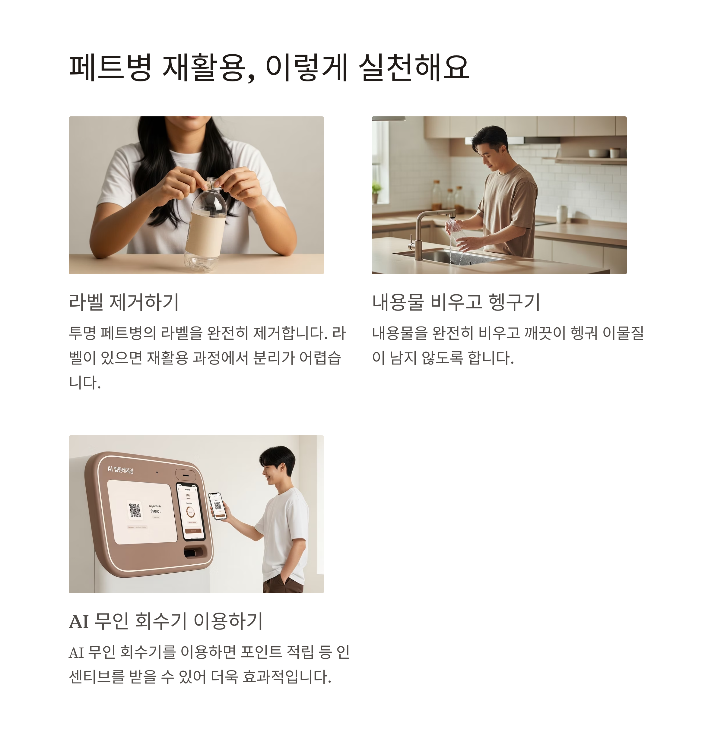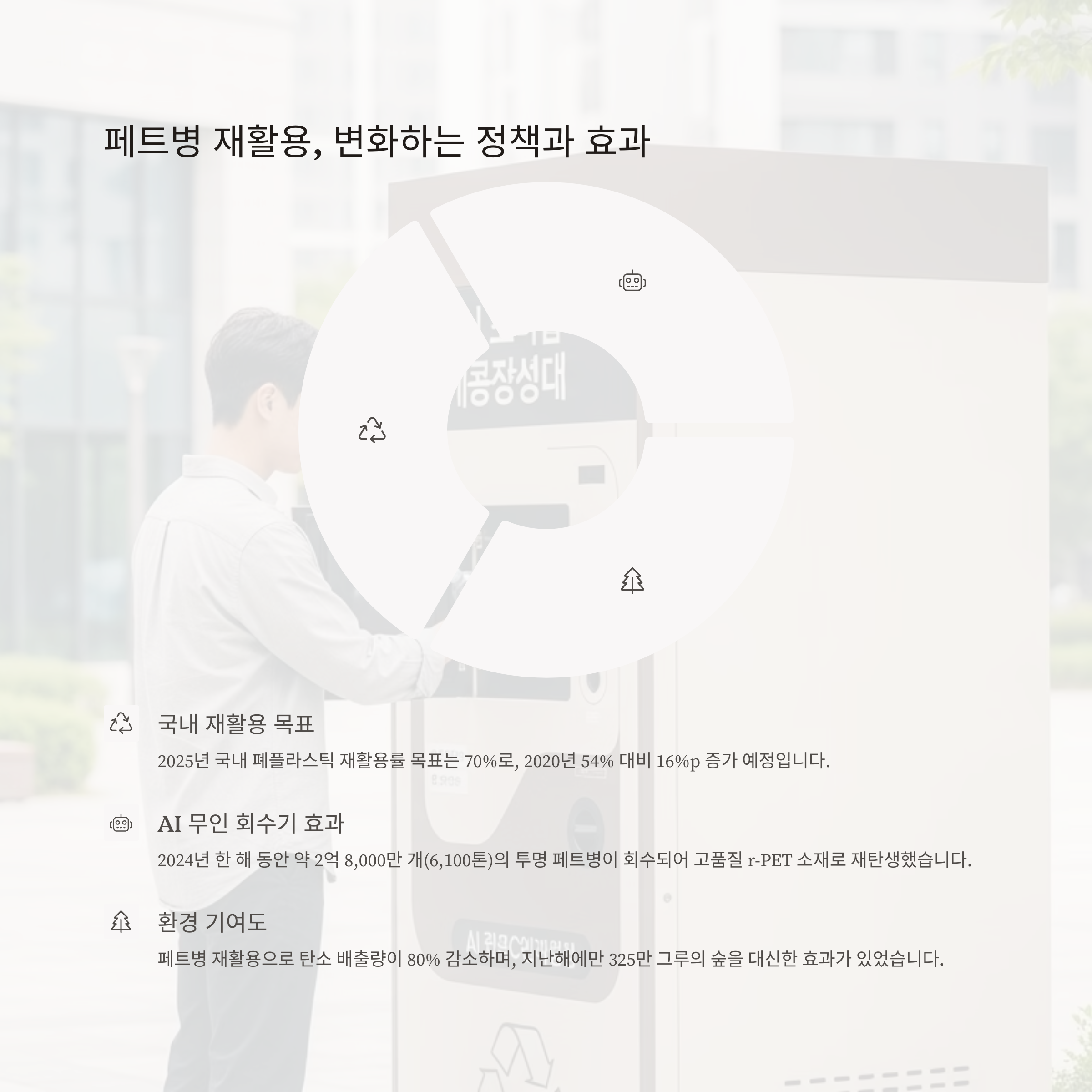 | 페트병 | 국내 재활용률 70% 목표, 6,100톤 수거 | 탄소 배출량 80%↓, 숲 대체 효과 |