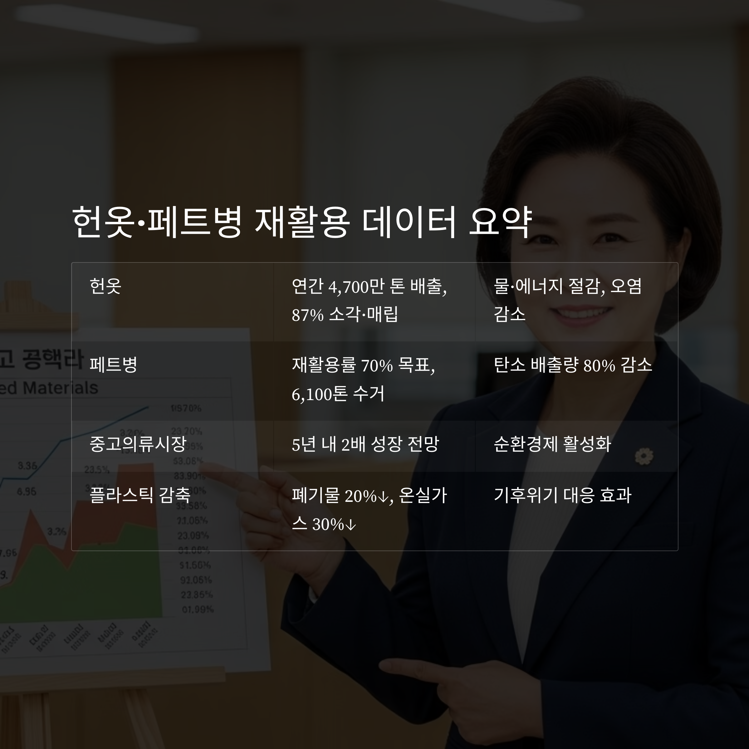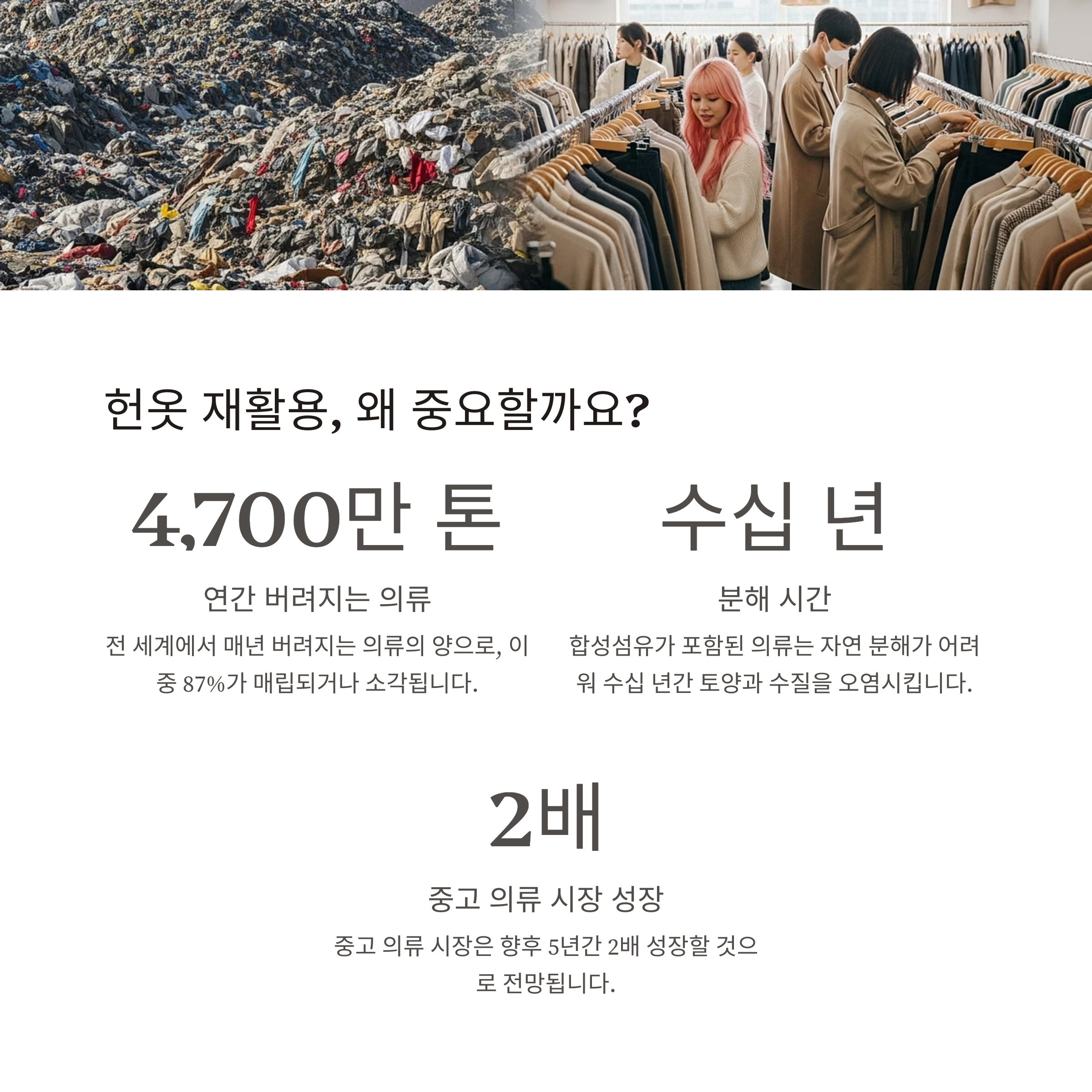 | 헌옷 | 연간 4,700만 톤 배출(글로벌), 87% 소각·매립 | 재사용·재활용으로 물·에너지 절감 |