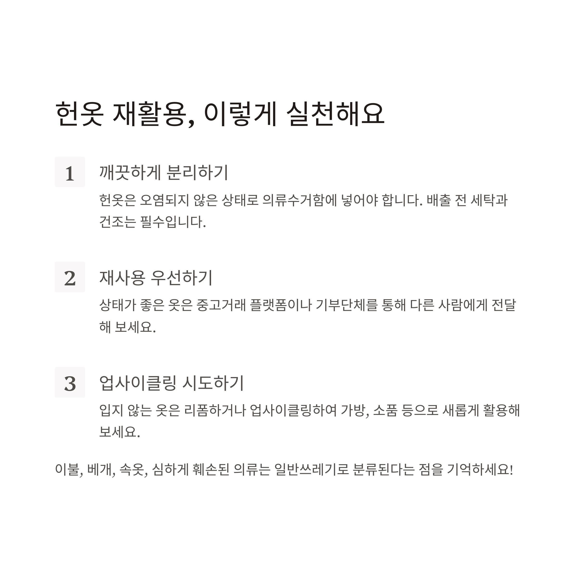 헌 옷은 오염되지 않은 상태로 의류수거함에 넣어야 합니다.