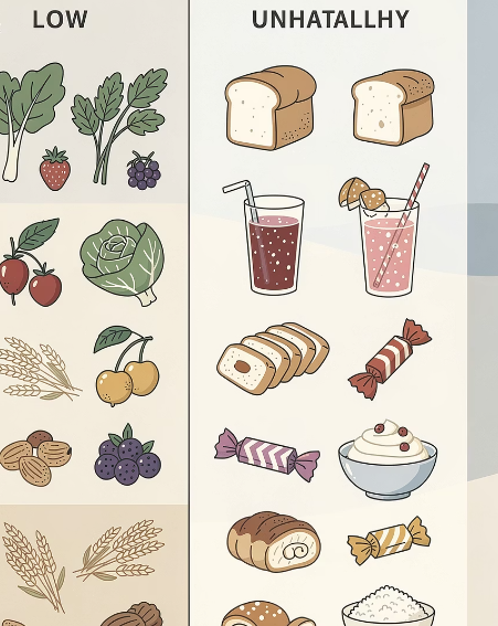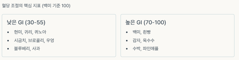 | 곡류 | 현미, 귀리, 퀴노아 (30~55) | 백미, 흰빵, 감자 (70~100) |