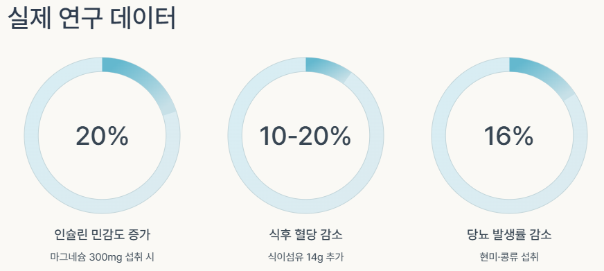 - 식이섬유 14g 추가 섭취 → 식후 혈당 10~20% 감소