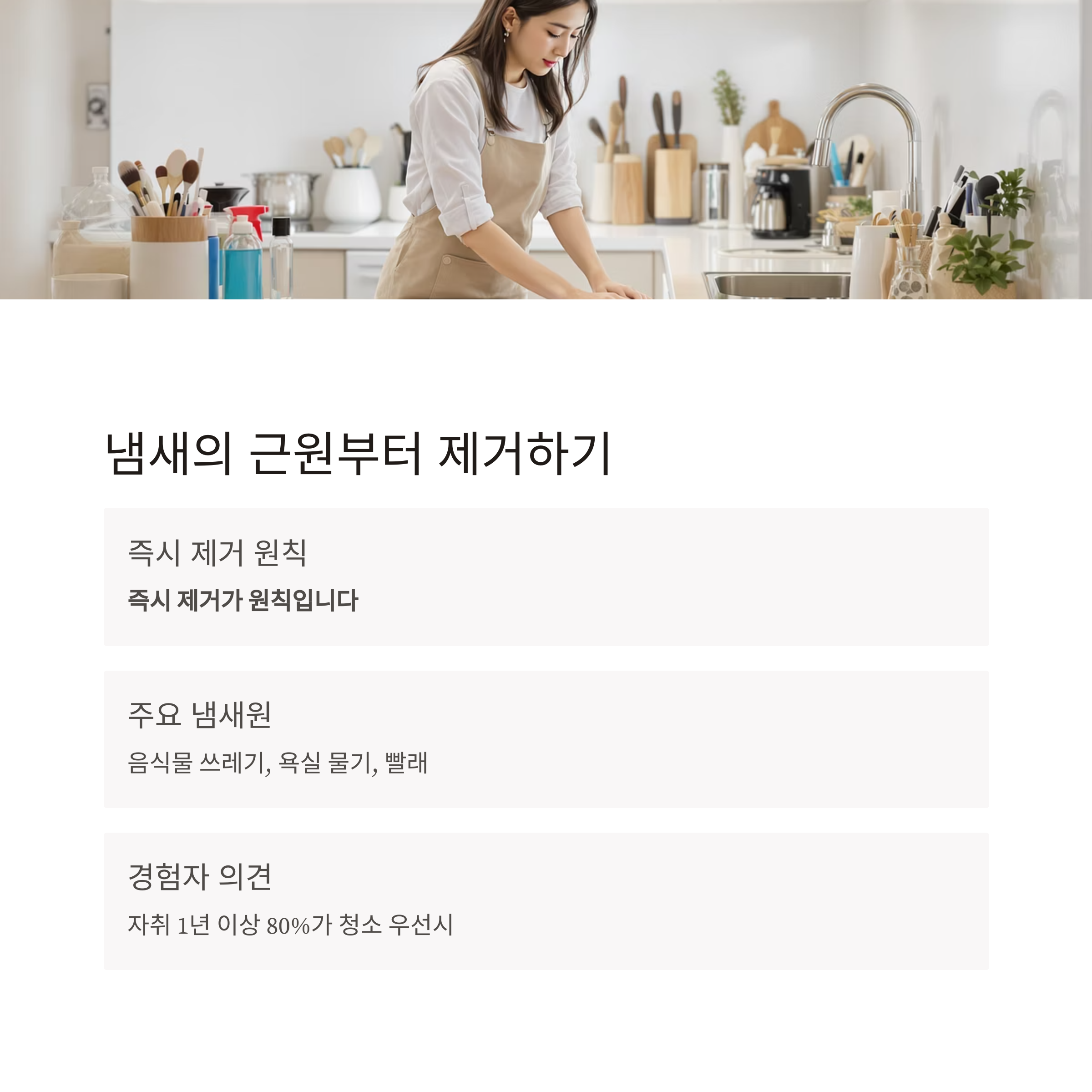 음식물 쓰레기, 욕실 물기, 빨래 냄새 등은 즉시 제거가 원칙입니다.