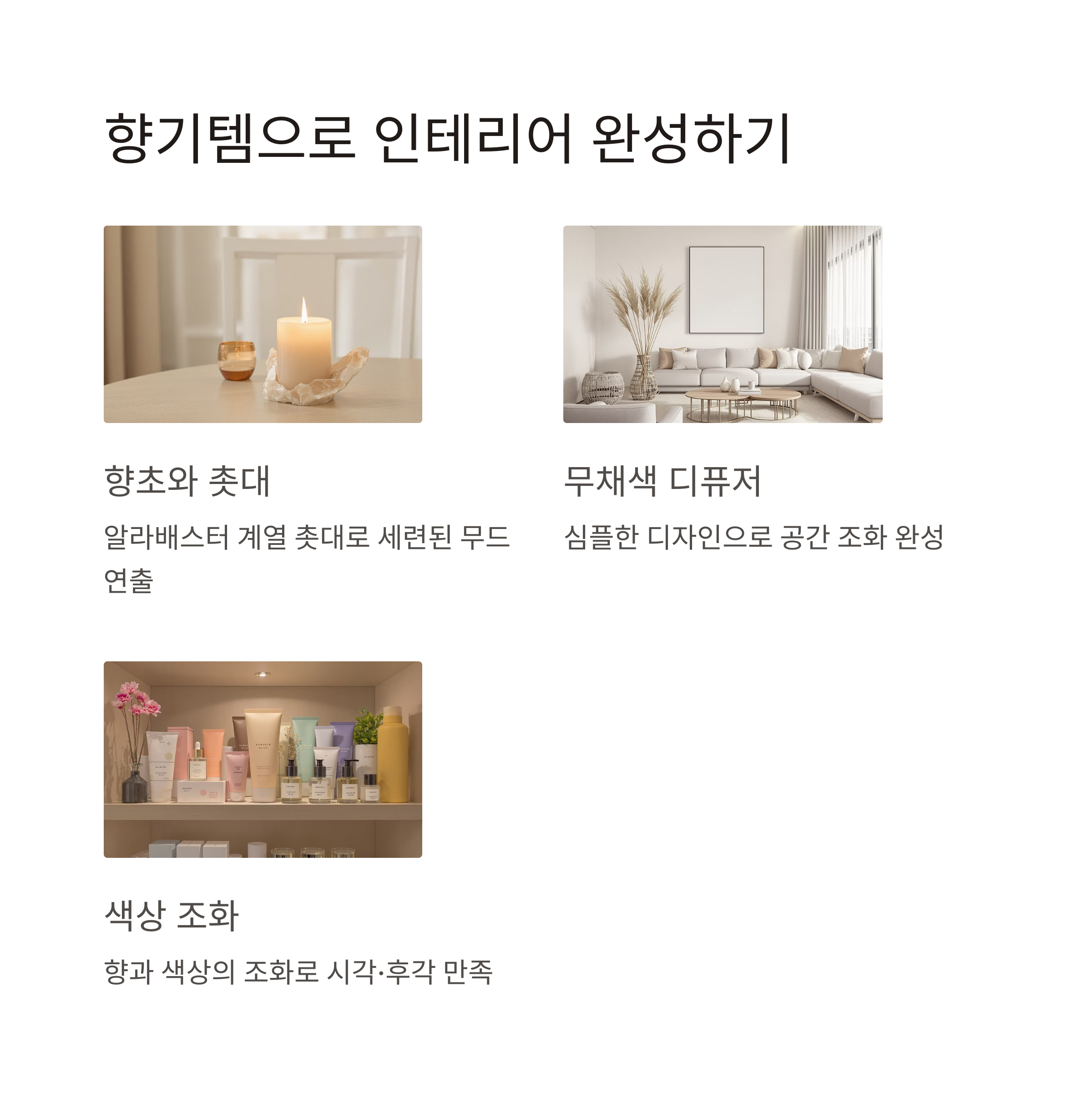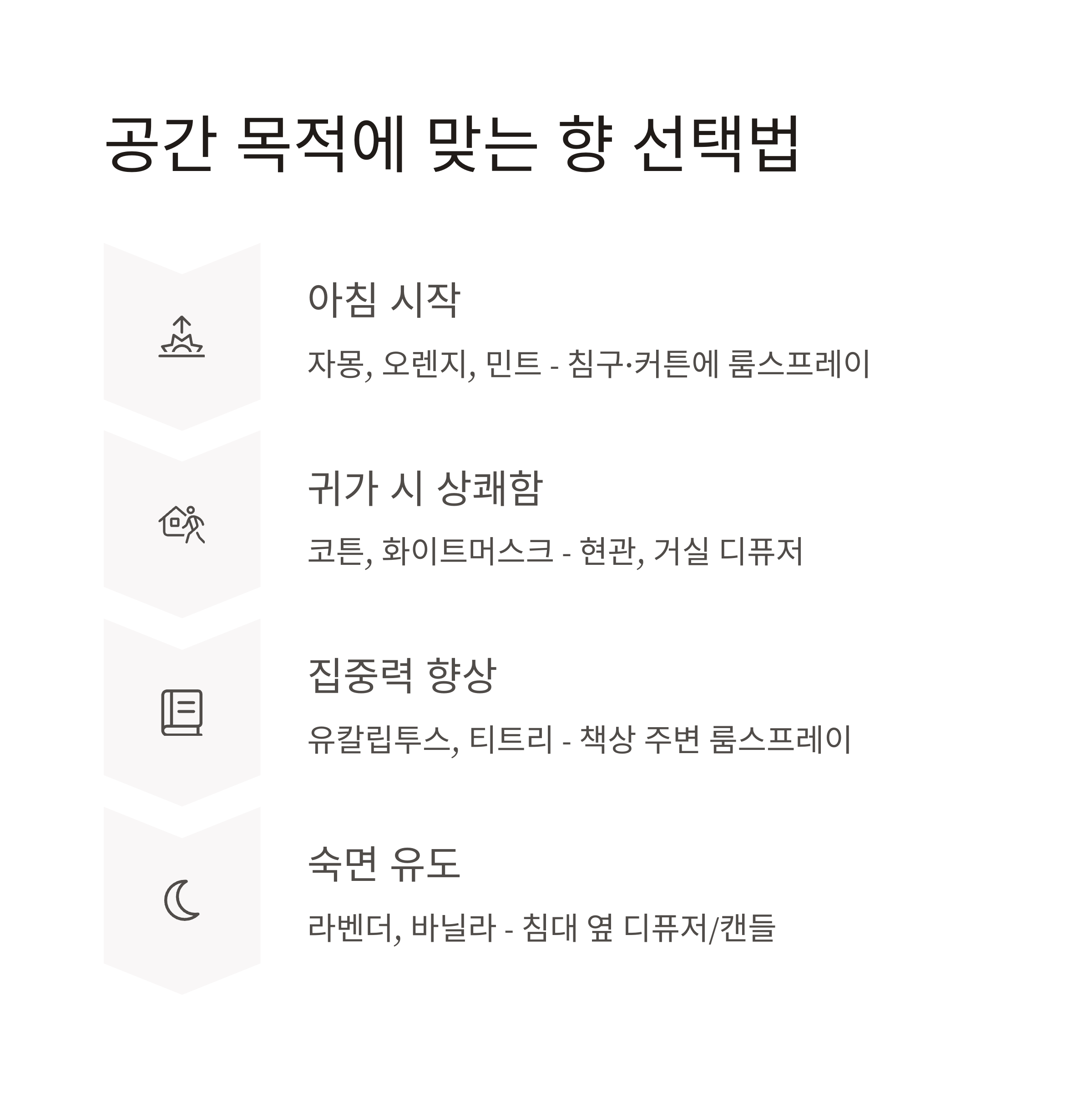 | 숙면과 안정감 유도 | 라벤더, 바닐라, 샌달우드 | 침대 옆 디퓨저 또는 캔들 배치 |