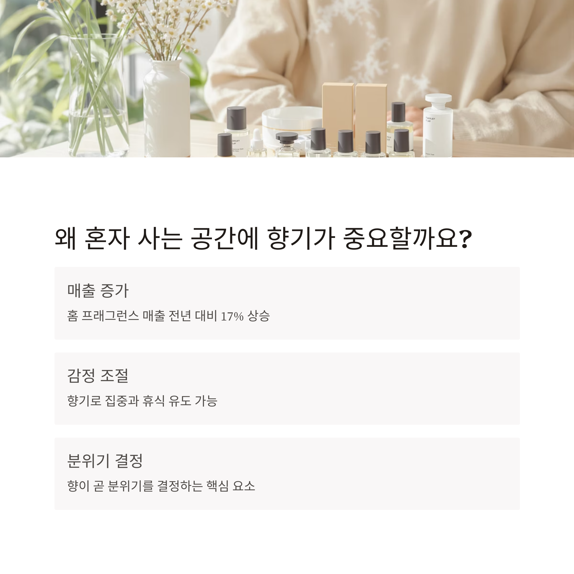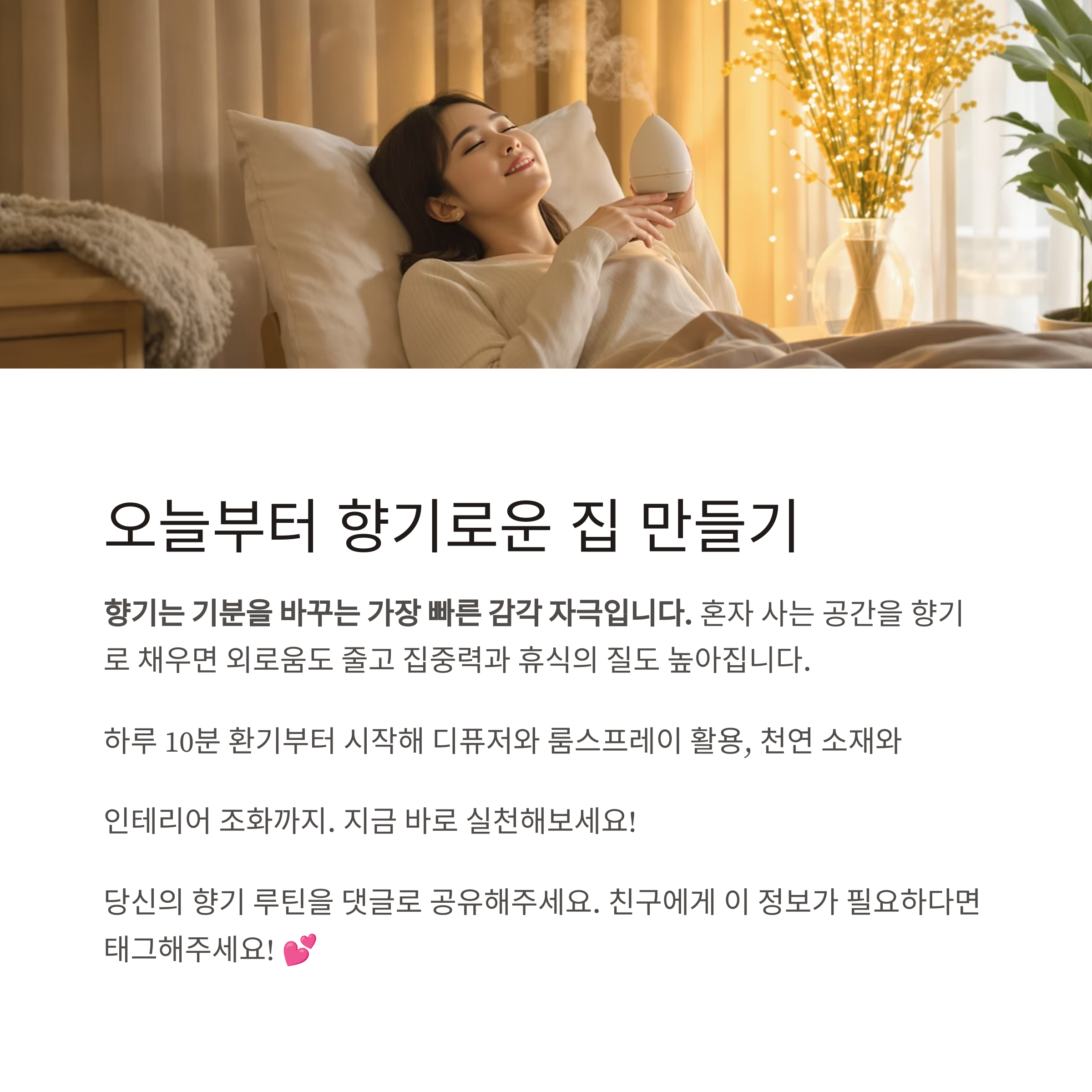 혼자 사는 집에서도 향기로 가득한 공간을 만들면 삶의 질이 확연히 달라집니다.
