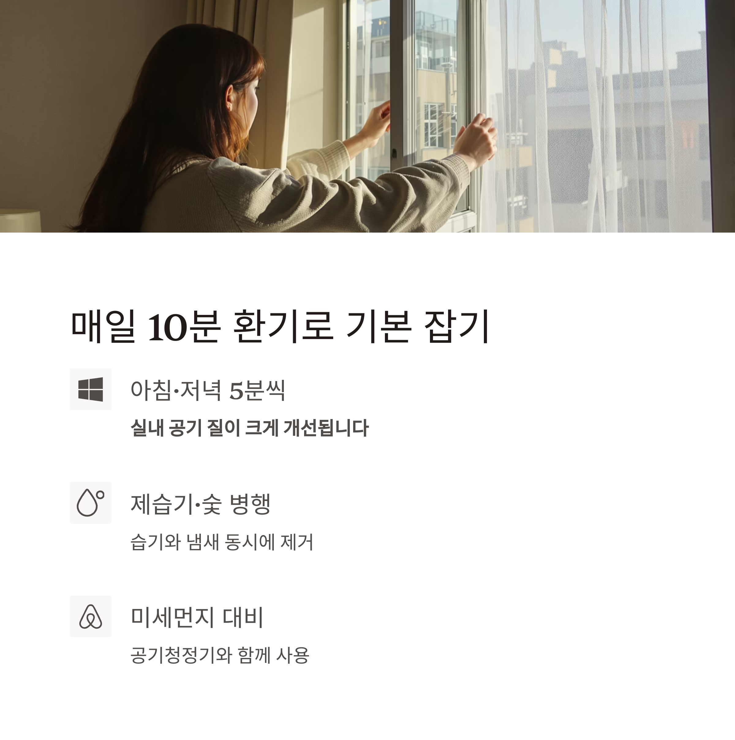 하루 두 번, 아침과 저녁에 5분씩 창문을 열어 환기하면 실내 공기 질이 크게 개선됩니다.