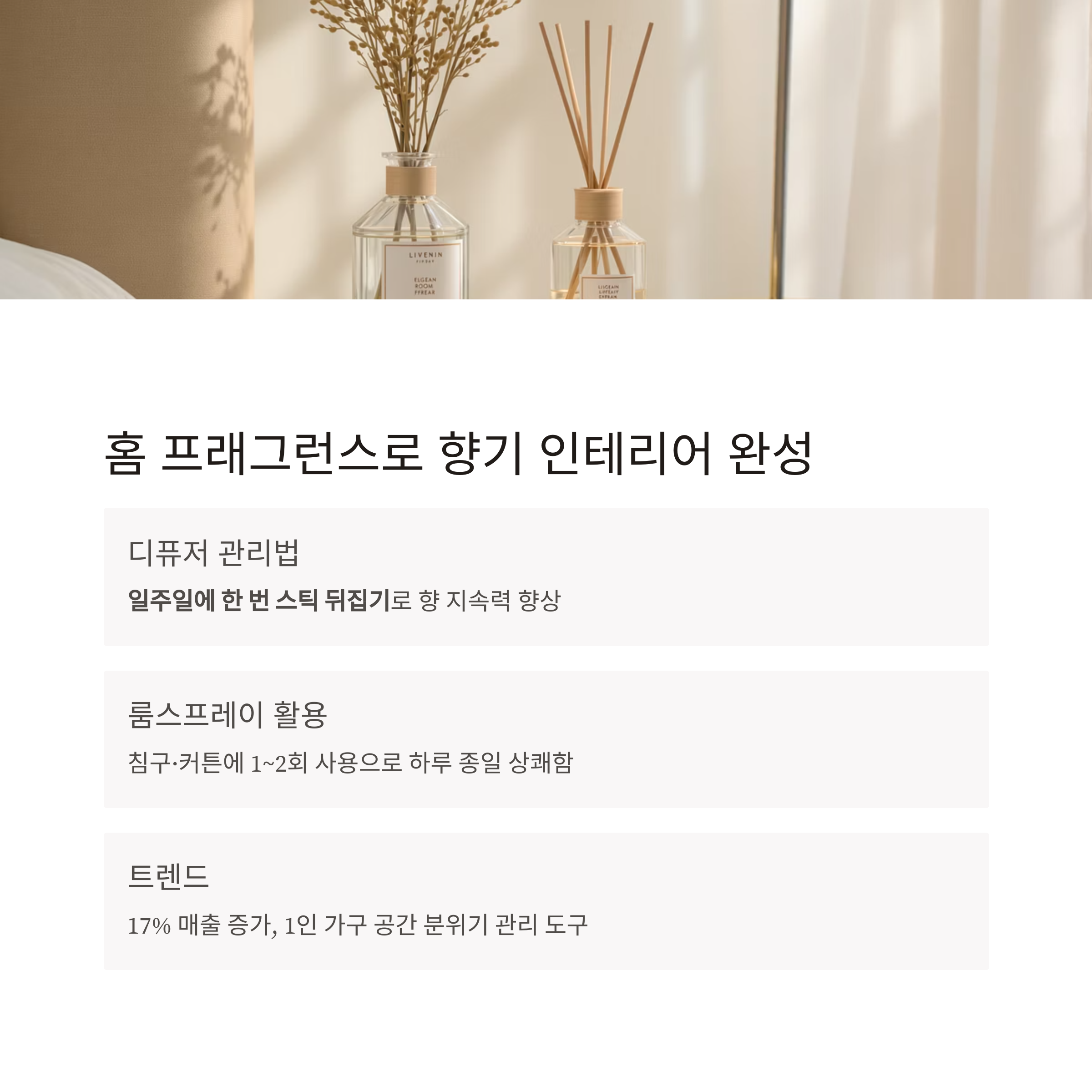 2024년 CJ올리브영 자료에 따르면 디퓨저, 향초 등 홈 프래그런스 매출이 전년 대비 17% 상승했습니다.