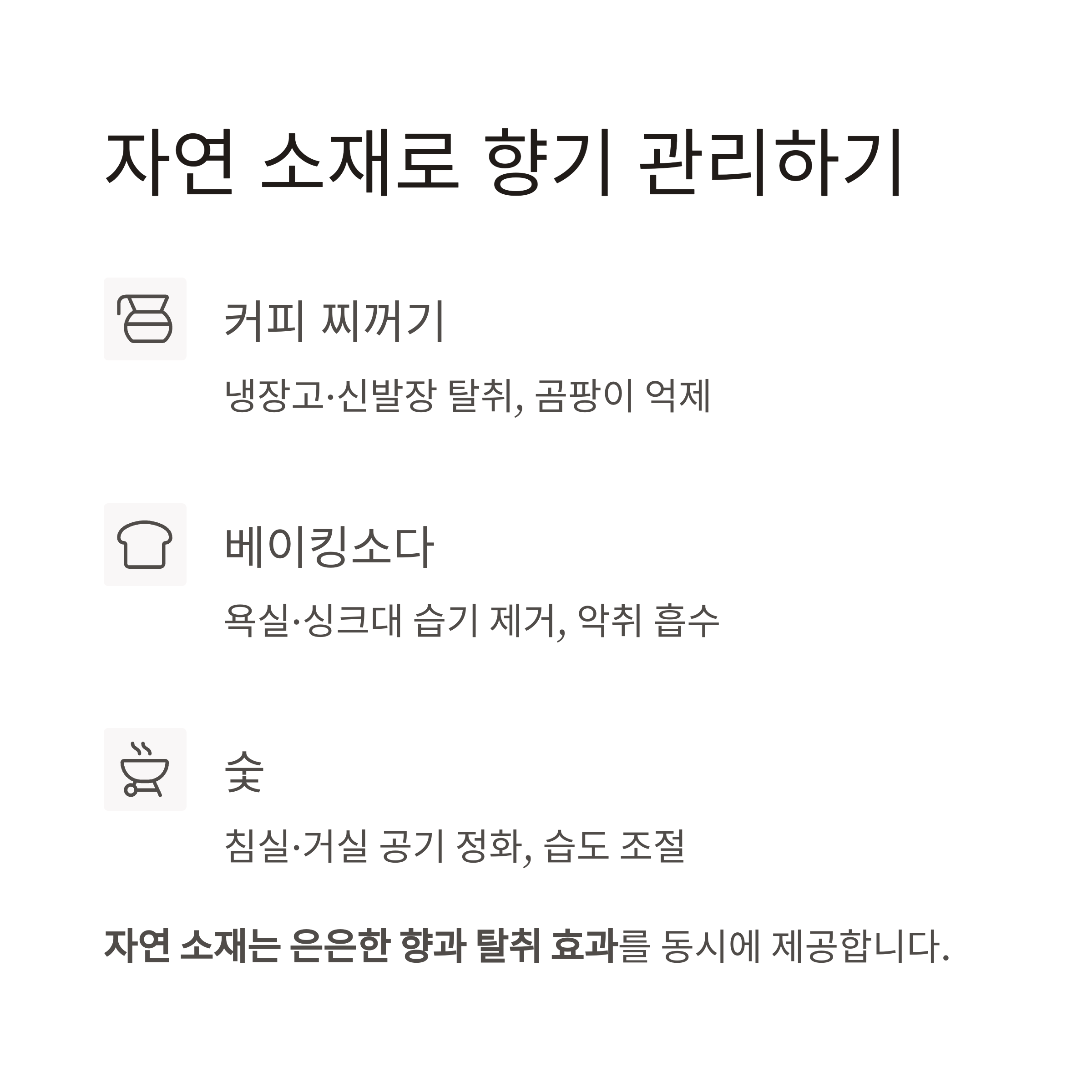 커피 찌꺼기, 숯, 베이킹소다 등 자연 소재는 은은한 향과 탈취 효과를 동시에 줍니다.