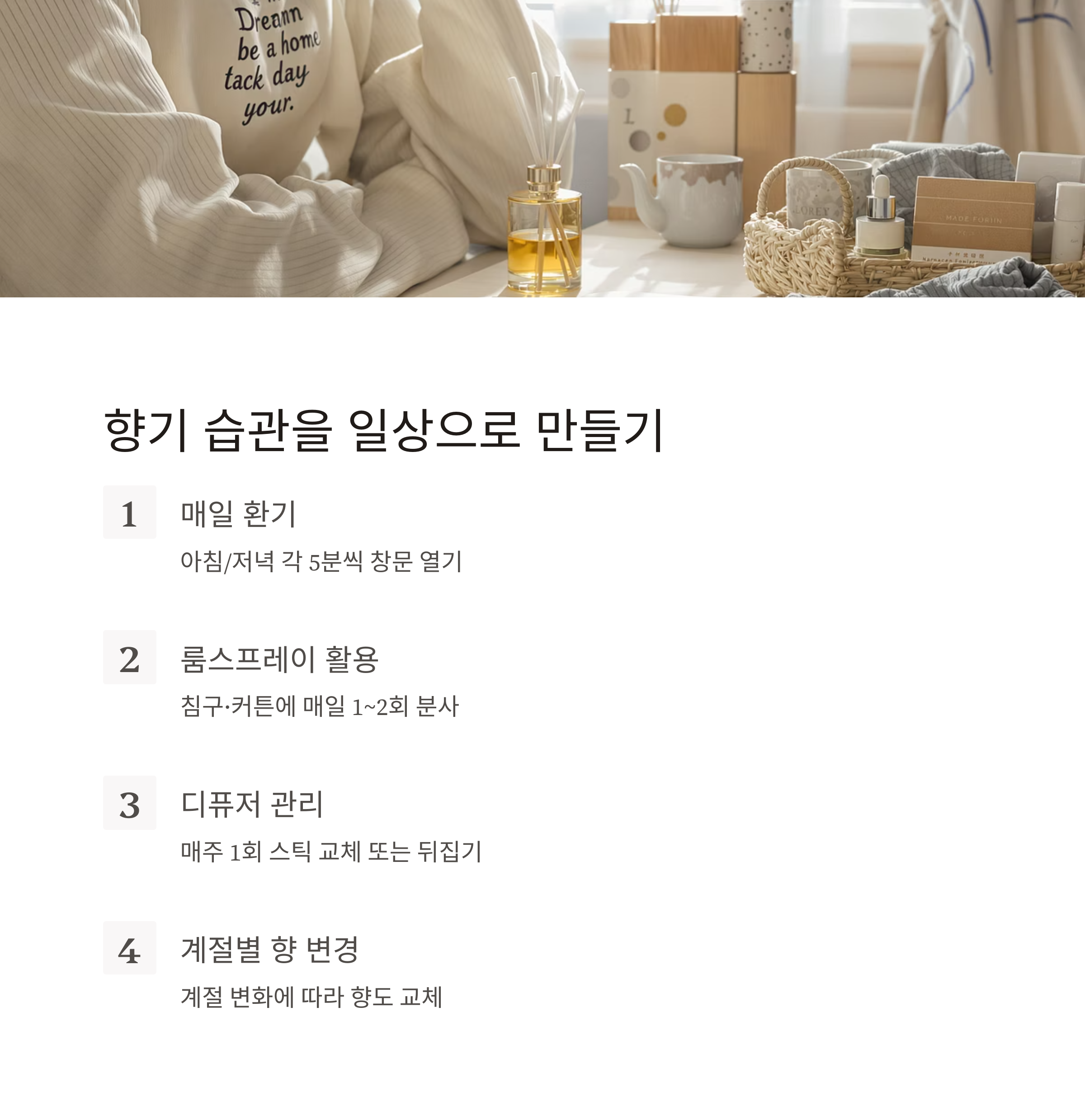 이런 루틴이 정착되면 공간의 향기가 일상으로 연결되어 삶의 질까지 상승하게 됩니다.