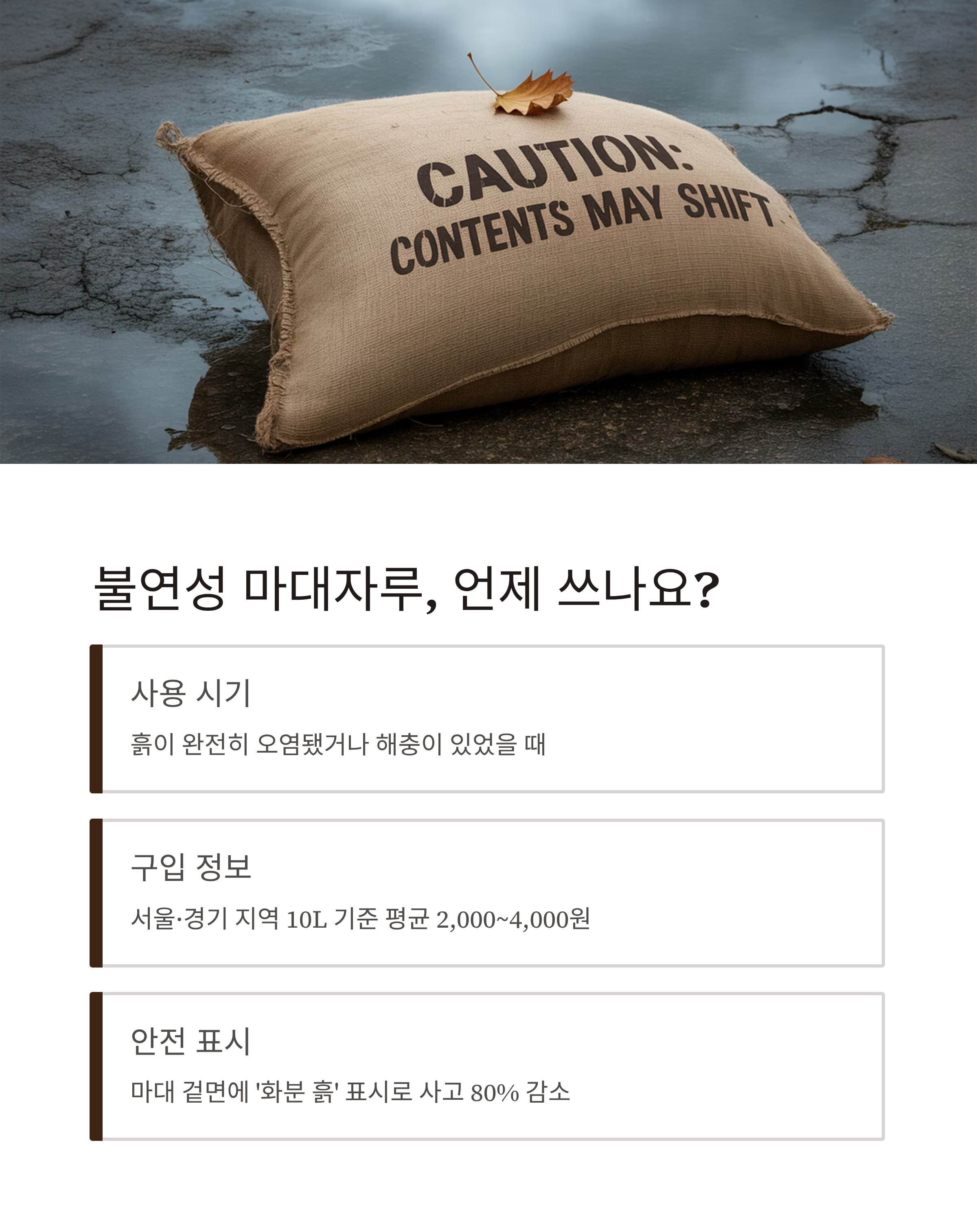 서울·경기 지역 기준, 동주민센터나 마트에서 10L 기준 평균 2,000~4,000원 정도면 구입 가능하며, 마대 겉면에는 꼭 '화분 흙'이라고 써주세요.