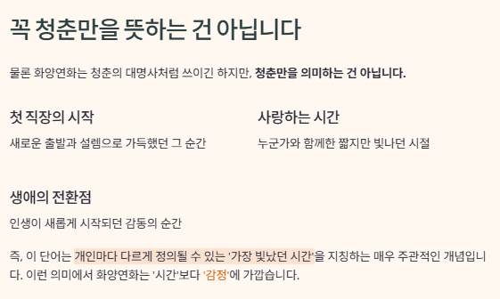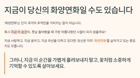 그래서 화양연화는 단어 자체로도 묘한 아련함을 남기며, 회상과 그리움을 담아낼 때 자주 등장합니다.