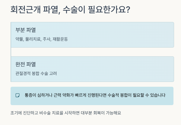 통증이 심하거나 근력 약화가 빠르게 진행된다면 수술적 봉합이 필요할 수 있습니다.