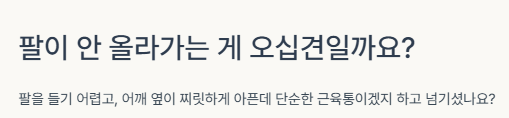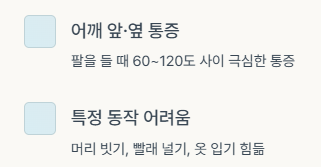 | 운동 범위 제한 | 등 뒤, 머리 위 동작 제한, ‘걸리는 느낌’ |