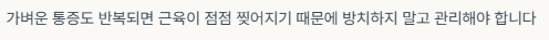 가벼운 통증도 반복되면 근육이 점점 찢어지기 때문에 방치하지 말고 관리해야 합니다.