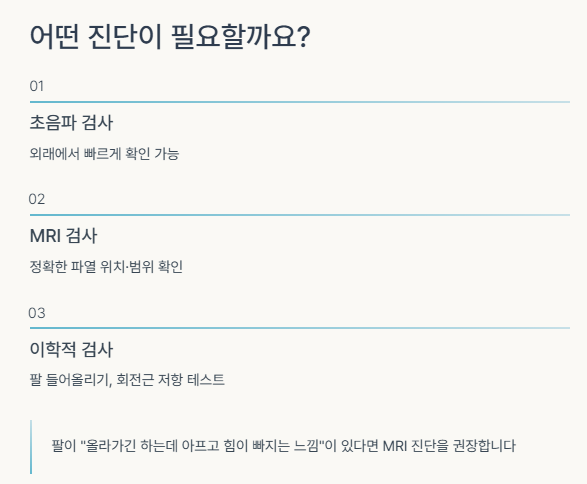 팔이 "올라가긴 하는데 아프고 힘이 빠지는 느낌"이 있다면 MRI 진단을 권장합니다.