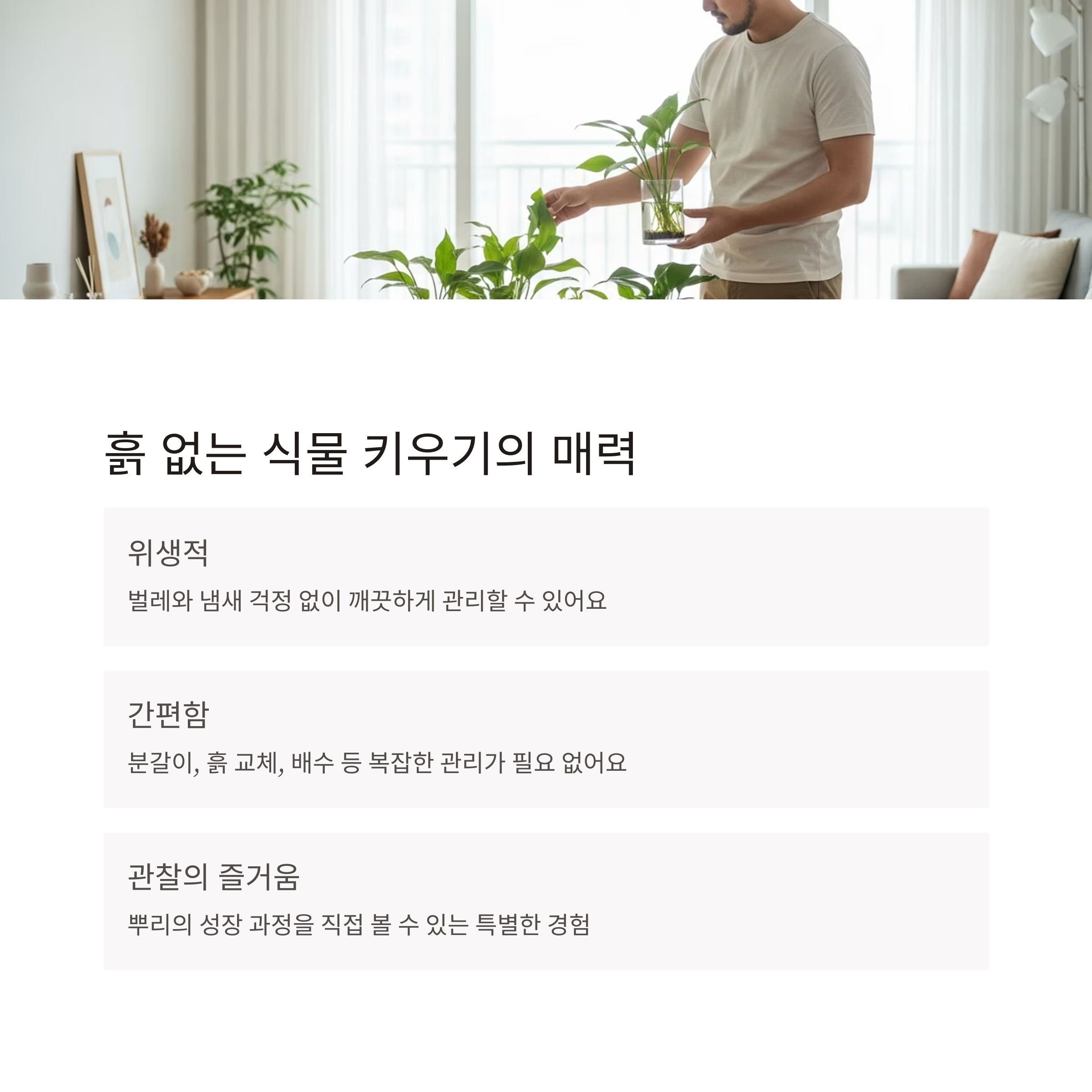 분갈이, 흙 교체, 배수 등 복잡한 관리가 없다는 점은