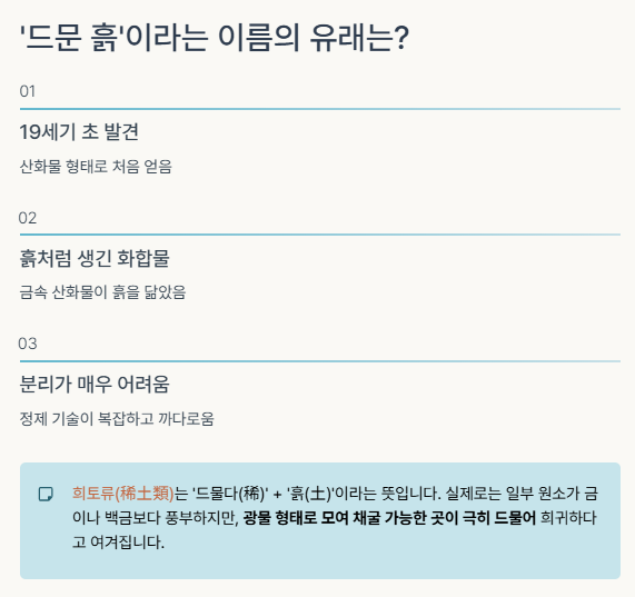 ‘희토류(稀土類)’는 ‘드물다(稀)’ + ‘흙(土)’이라는 뜻입니다.