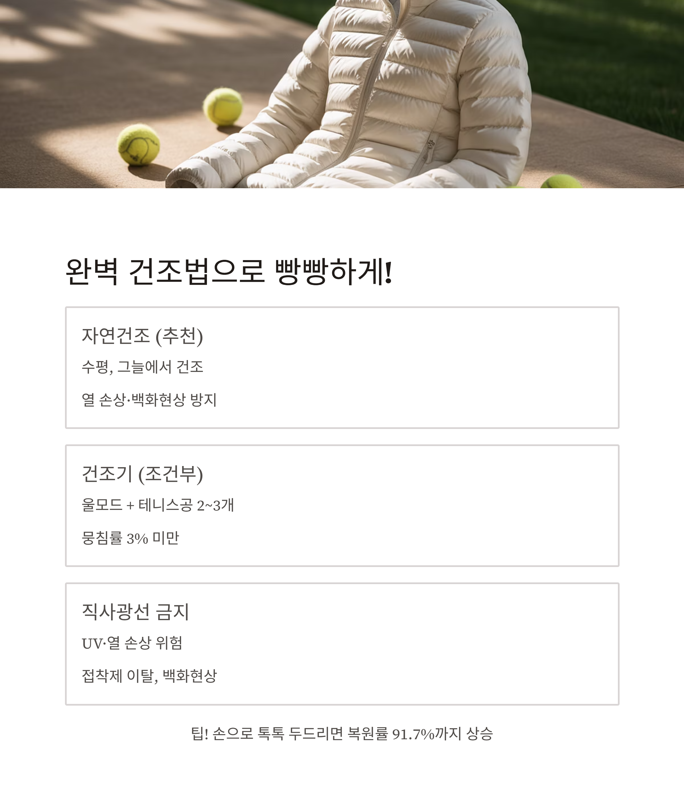 | 자연건조(수평, 그늘) | 매우 추천 | 열 손상·백화현상 방지, 복원력 유지(최고 회복률) |