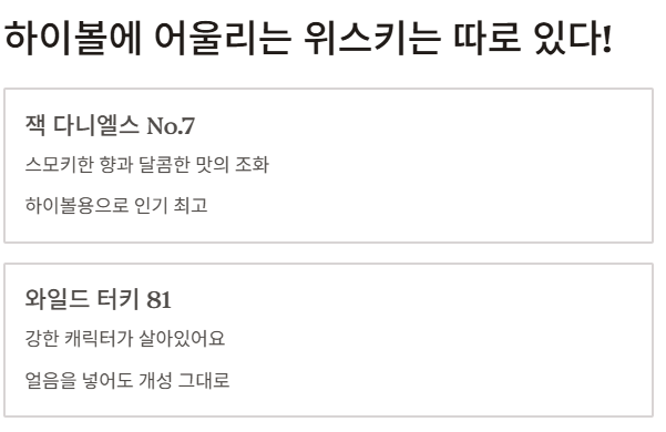 | 하이볼이 좋은 날 | 잭 다니엘스, 와일드 터키 | 청량하면서도 개성 있는 향미 |