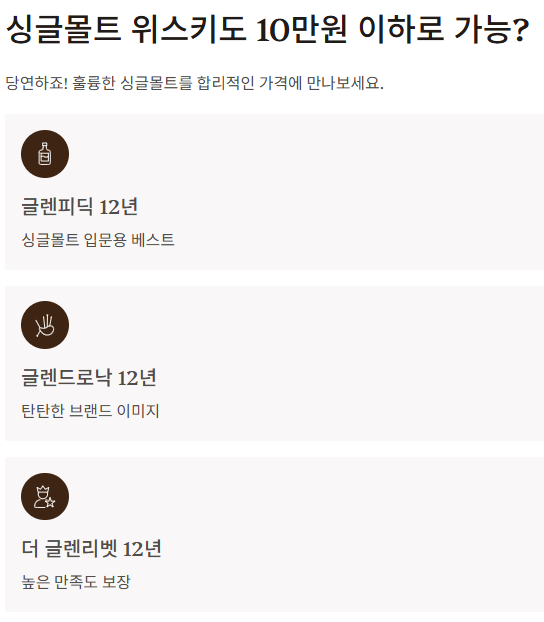 | 본격 위스키 입문 | 글렌피딕 12, 글렌드로낙 12 | 싱글몰트 특유의 깊은 향과 맛 |